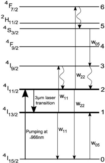 Le pompage se fait avec un tube flash durant 300 microsecondes avec une énergie pompe de 80J/cm3 ce qui donne pour ce barreau de diamètre 3mm x 62mm une énergie maximum de 30J. La durée de la transition 4I11/2 étant plus courte (1.2ms) que le niveau 4I13/2 (5.3ms) le pompage se produit par un processus complexe de transfert d'énergie des niveaux supérieurs par des photons verts et bleus émis par le tube flash. Il est donc important d'avoir une durée flash la plus courte (environ 300 microsecondes) pour avoir un rendement acceptable! Le rendement en pompage flash est de l'ordre de 1% et en pompage par diode à 962nm de l'ordre de 7%.