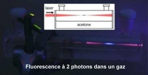 Cette expérience consiste à une absorption à 2 photons dans un gaz d'acétone permettant de visualisé le phénomène par une fluorescence bleutée!