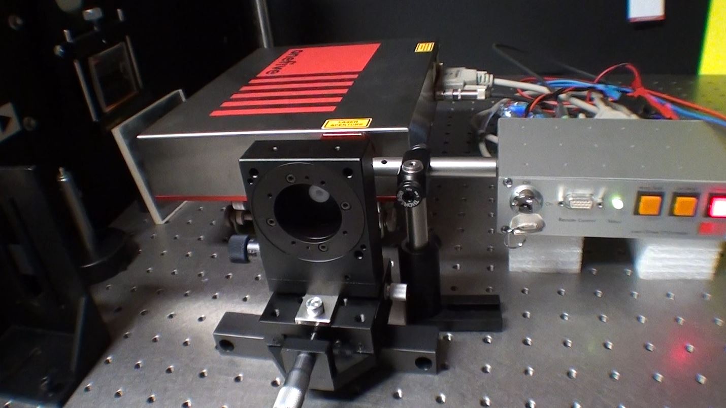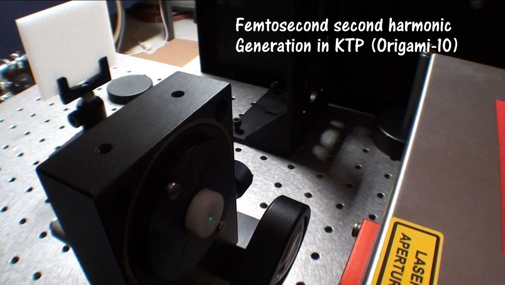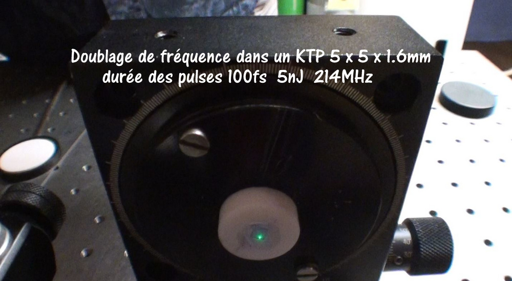 Premier test de doublage de fréquence dans un cristal KTP de 5 x 5mm et 1.6mm d'épaisseur. Pour une durée de pulse de 70 à 100fs l'épaisseur idéal du cristal doubleur devrait être de 30 microns! Malheureusement je ne possède pas cela et le prix est de 800 euro! Le laser est un ORIGAMI-10 de 5nJ à 214MHz (112mW)
