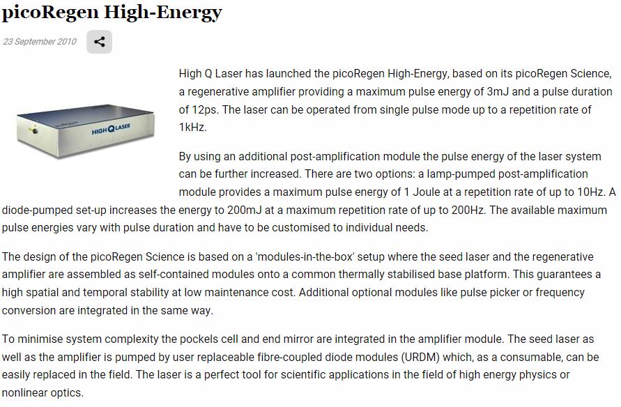 Je viens de recevoir ce laser avec une désignation picoREGEN IC40000 ps. Je vais l'inspecter ces prochains jours pour voir si c'est le modèle 3mJ ou 200mJ . Ce qui est sûr, c'est qu'il fait 40W donc il se peux bien que ce soit le 200mJ ! (17GW)