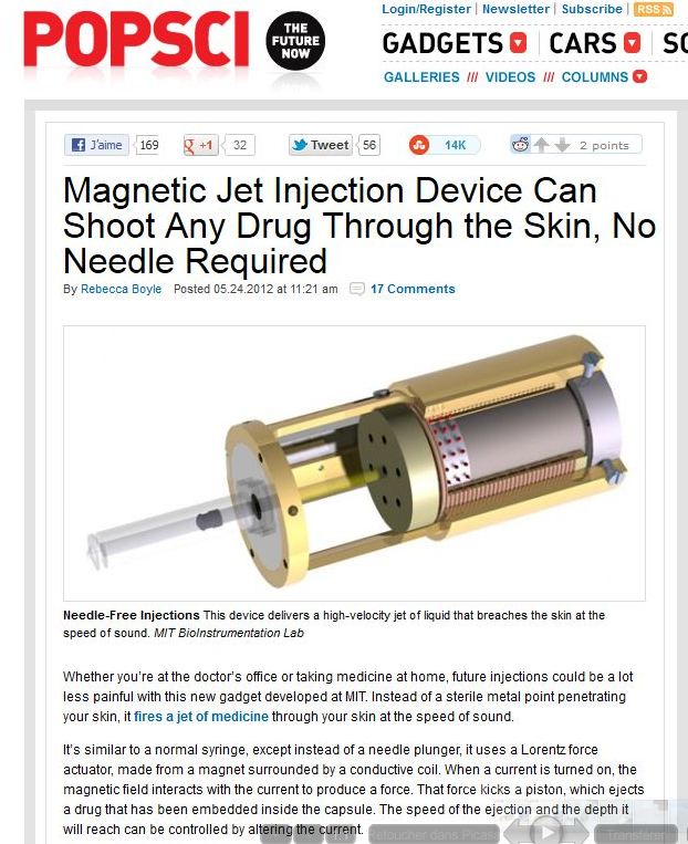 Par manque de temps et d'argent je n'ai pas déposé de brevet et maintenant 10 ans après c'est le MIT Bioinstrumentation lab aux USA qui à pris un brevet sur l'injecteur sans aiguille avec un actuateur "voice coil" !