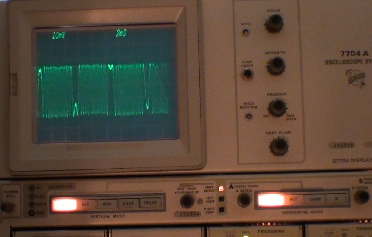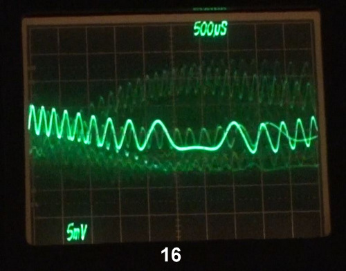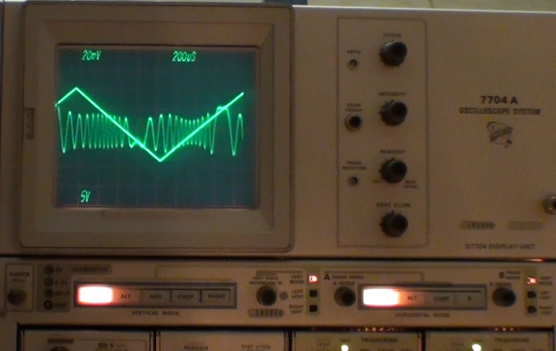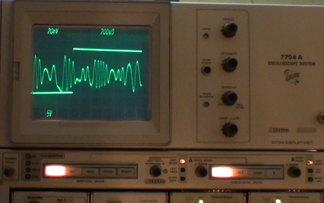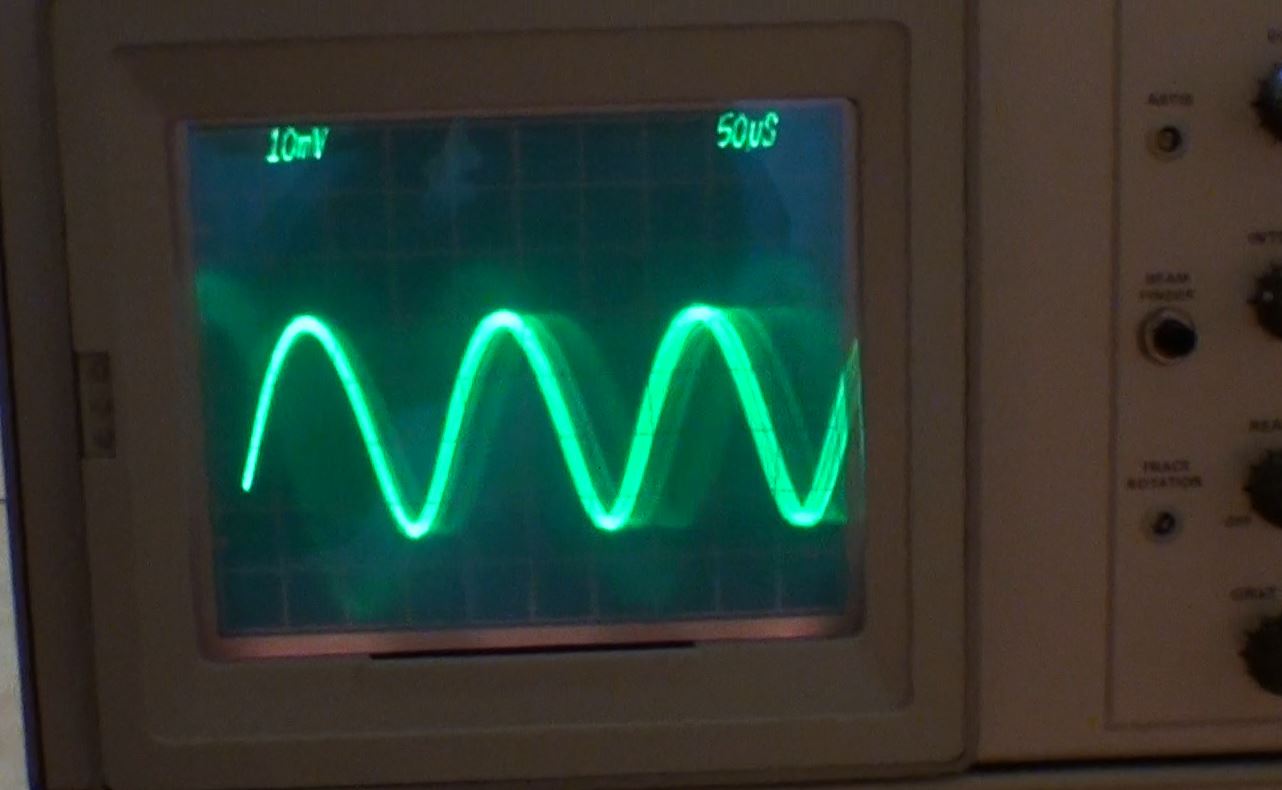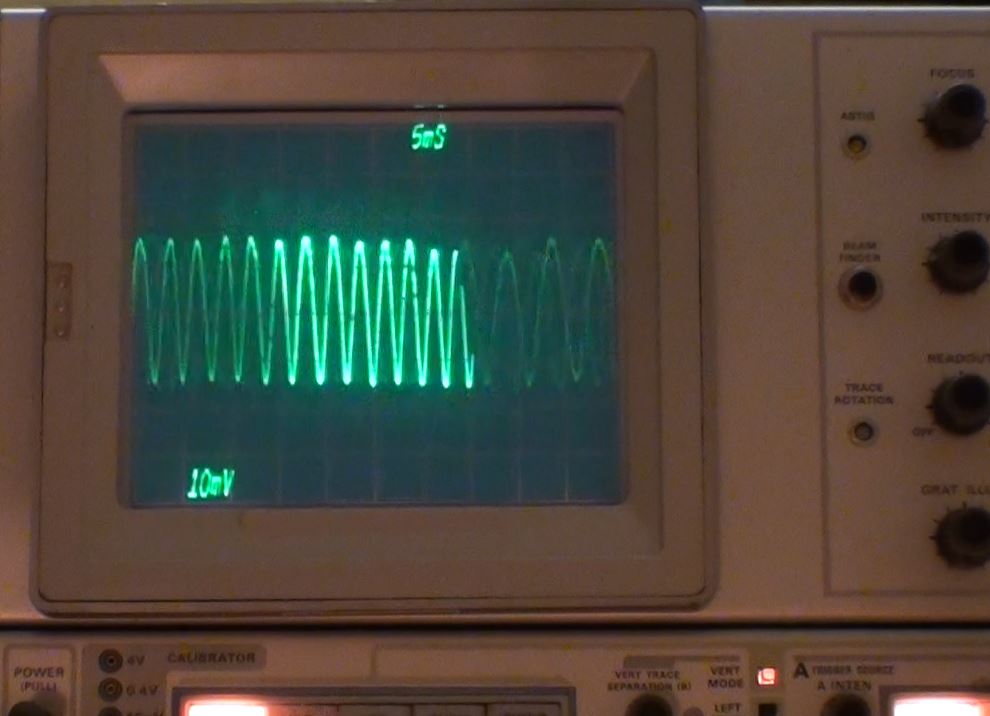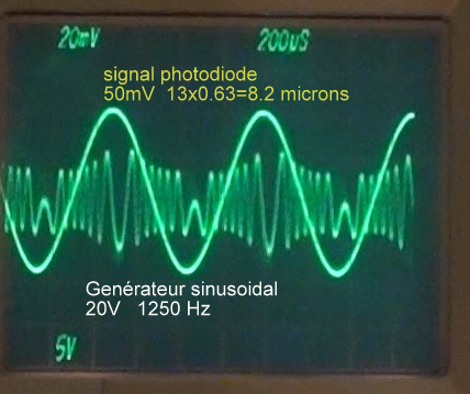 Analyse du signal: Le générateur donne un signal sinusoïdal de 20 volts à 1250 Hz. Le PZT bimorphe suit le signal avec un léger déphasage de l'ordre de 30°. Le signal d'interférence reçu sur la photodiode est de 50mV. Chaque sinusoïde correspond à une longueur d'onde du laser source ici un laser HeNe soit 623,8nm. On compte 13 sinusoïdes sur une période soit une distance 8.2 microns ! J'ai également fait des tests avec un signal triangulaire et carré. Le problème majeur avec les bimorphes est le résonance ce qui fait que pour certaines fréquences ils ne sont pas adaptés.