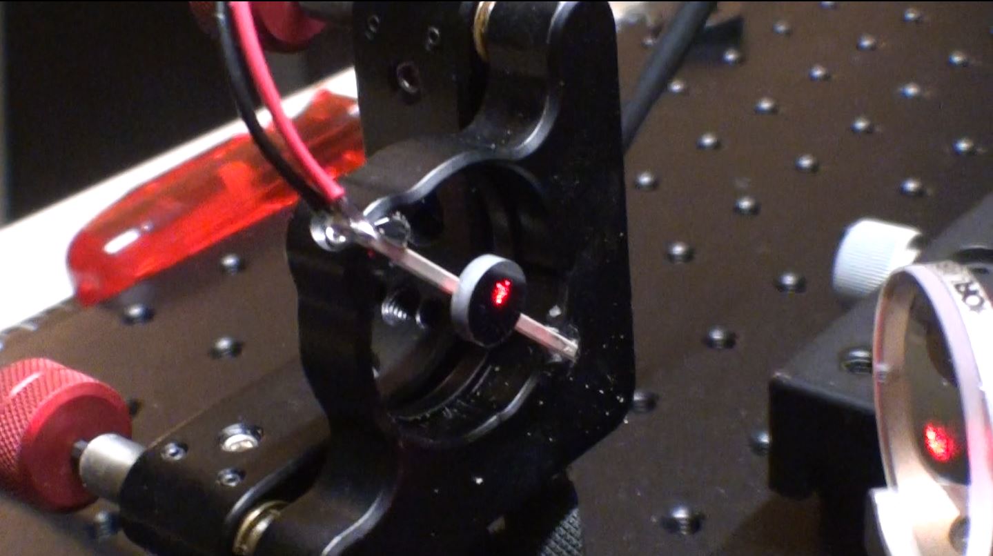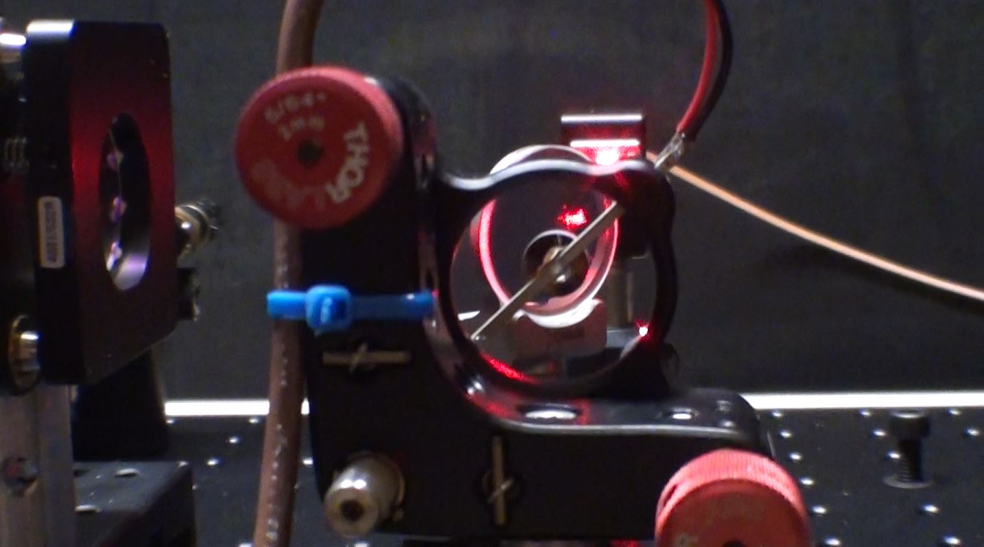 Dans ce teste j'utilise une lame bimorphe en PZT collé par une goutte de colle silicone sur un coté seulement et un miroir aluminisé de 6mm de diamètre collé un milieu du bimorphe selon le schéma ci-dessous: