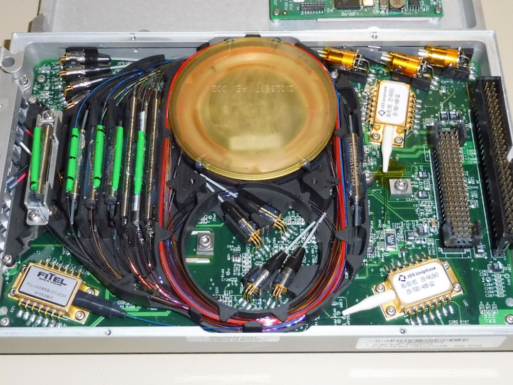Voici un laser amplificateur composé de 14 diodes lasers fibrées et de 3 fibres dopées à l'erbium permettant d'amplifier un signal laser. Ce type d'amplificateur se retrouve sur les lignes à fibre optiques de communication intercontinental tous les 80km pour amplifier le signal laser. Je l'ai acheter sur Ebay pour 35 euro ! Le but est de pouvoir récupérer les diodes lasers fibrées, les fibres Erbium ansi que les coupleur WDM pour pouvoir un jour réaliser un laser femtoseconde à fibre. Pour cela il faudra trouver une machine à souder les fibres monomode entre elles.