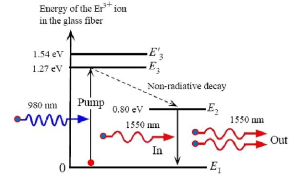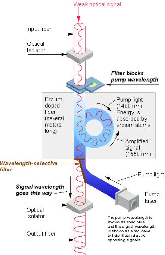 Le principe de fonctionnement est le suivant: une fibre optique amplificatrice dopée à l'erbium reçoit un signal optique de faible intensité qui est amplifier au moyen d'un faisceau laser pompe généré par une diode laser. Le faisceau pompe crée un gain positif dans la fibre ce qui amplifie le faible signal qui ressort amplifier.