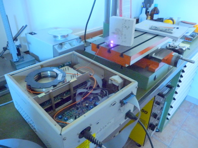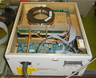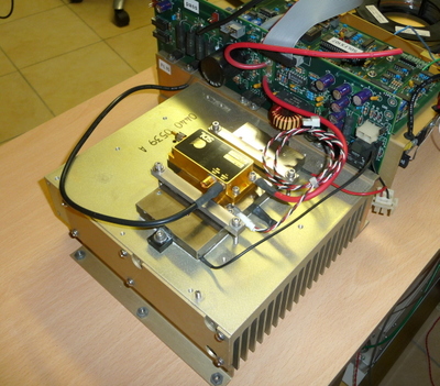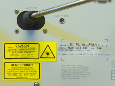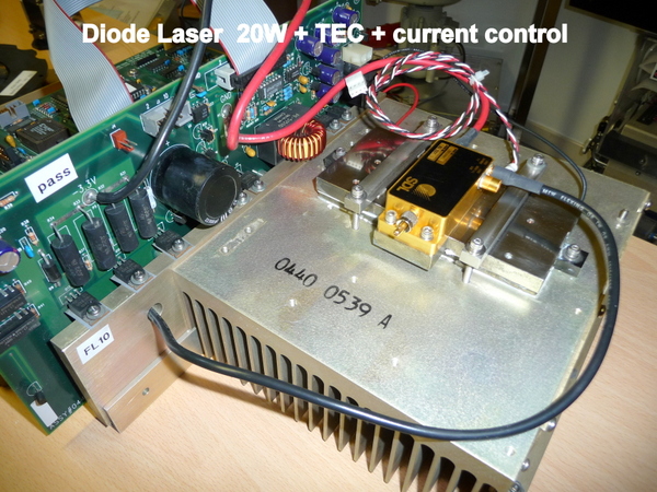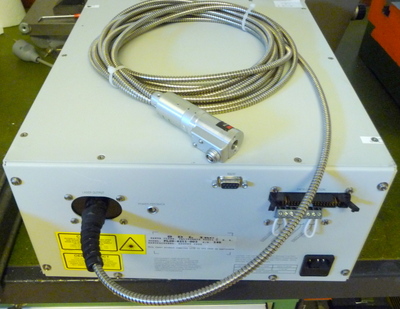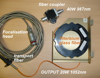 Voici un laser à fibre de 20W HE11. Le laser à fibre d'Ytterbium présente 2 avantages énormes c'est à dire que ce laser est un laser 2 niveaux avec un dopage pouvant aller à 10% et une longue durée de vie radiative ce qui permet d'obtenir de forte énergie pulsée et de grande puissance de sortie et un rendement quantique proche de 92%! La diode laser de pompe ayant un rendement proche de 50% ce qui donne un rendement de conversion elecrique-laser de 46%. Un autre avantage est la bonne dissipation thermique due au petit diamètre de la fibre et sa grande longueur donc un rapport volume pompé surface de dissipation très grand.