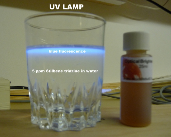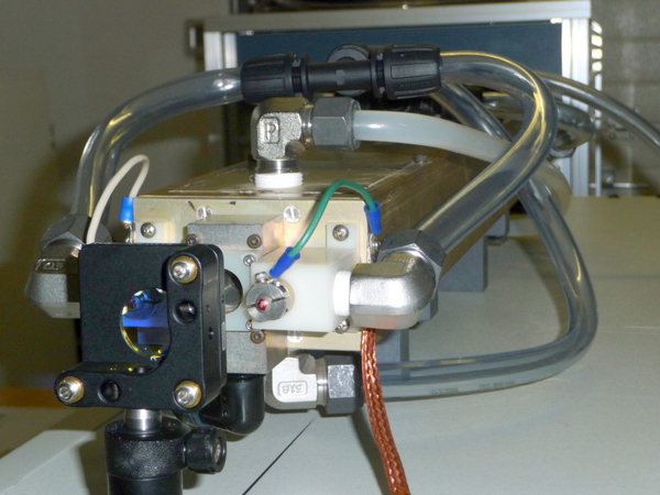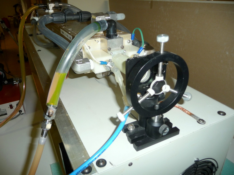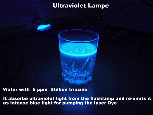 Le refroidissement des tubes flashs est assuré par une solution d'eau déminéralisée contenant 5ppm de stilbène triazine qui converti le rayonnement UV issue de la décharge flash en lumière bleu pour pompé le colorant et en même temps pour éliminer le rayonnement UV qui détruit le colorant !