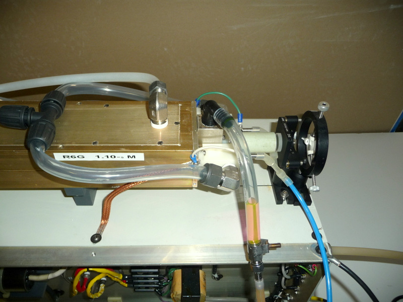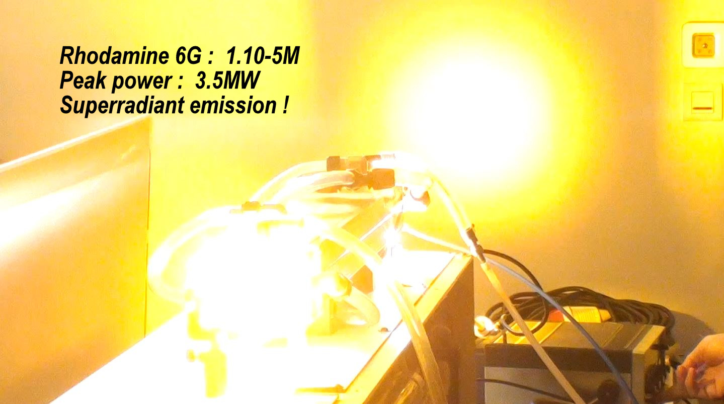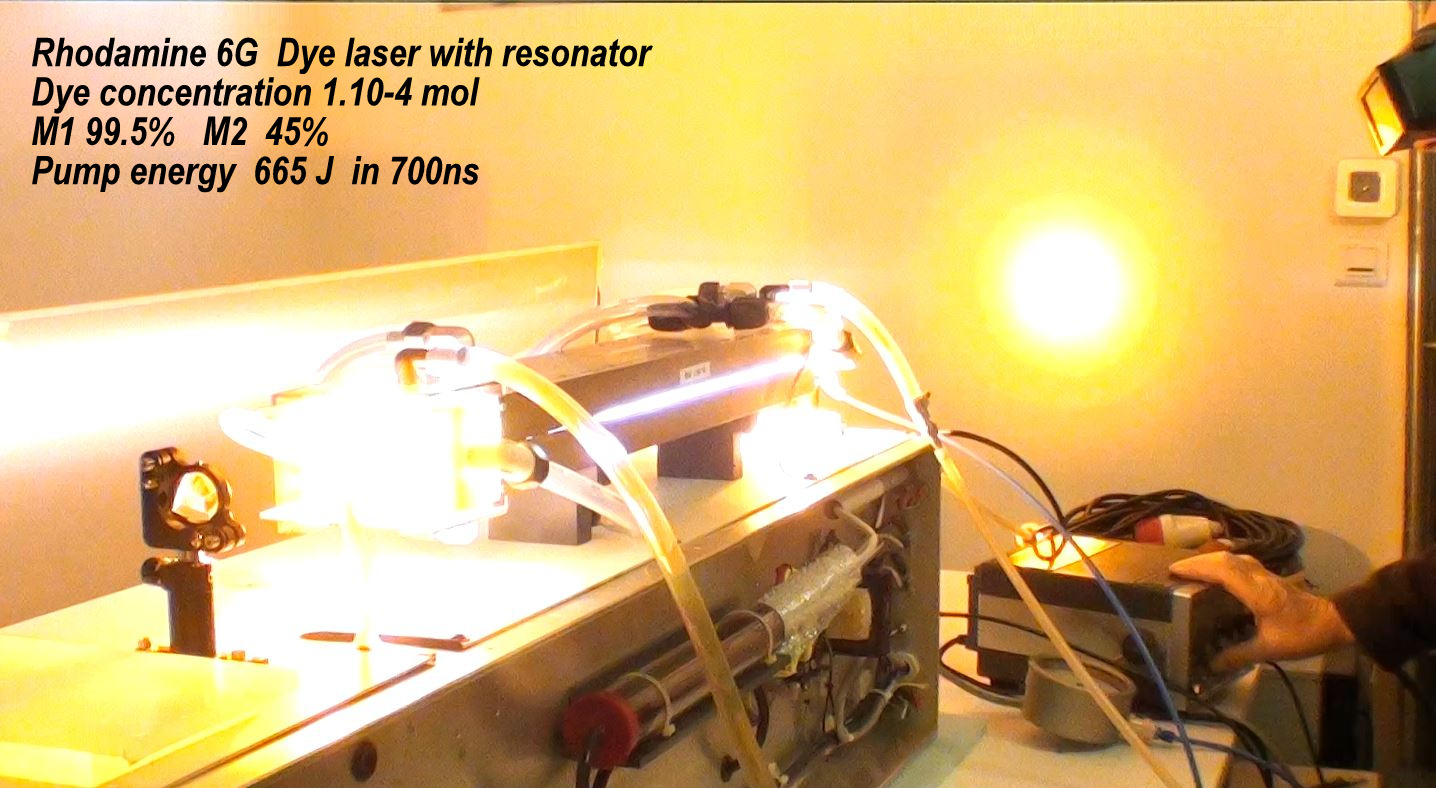 Ici le tube laser contenant une solution de 1.10-4 Mol. de Rhodamine 6G dans un mélange d'eau déionisée et d'éthanol 50/50 est muni d'un résonateur plan/plan composé d'un miroir aluminisé 98% de réflectivité et reflecd'un miroir multidiélectrique à 45% de réflectivité.