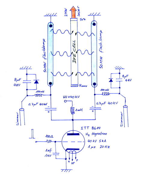 Le circuit de décharge se compose de 2 condensateurs MAXWELL® de 0.66 uF 60 kV chacun alimentant 1 tube flash au xénon. L'énergie de décharge maximum est de 1 kJ en 1 us soit une puissance instantanée de 1GW! La commutation se fait au moyen d'un thyratron à hydrogène, ce qui permet un fréquence de répétition de 10 pps. Pour cela il faut une alimentation de 40 kV et 10 kJ/s ! Le thyratron ITT 8614 ou HY-5 travail avec une tension maximum de 40kV et 5kA pour le courant de décharge. La tension filament est de 6.3V 30A et la tension réservoir 4.5V 11A la tension grille de 1300V
