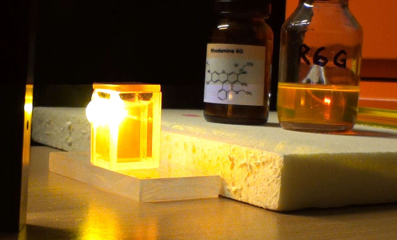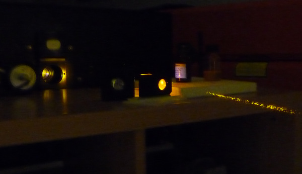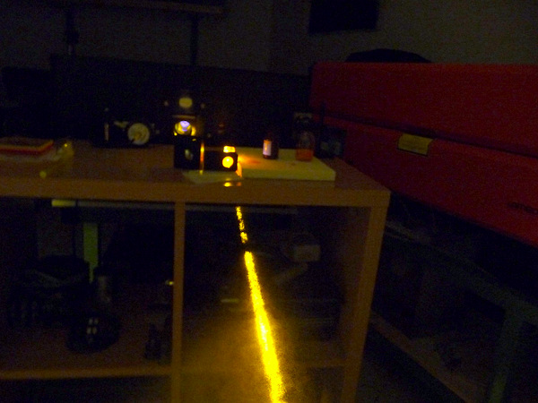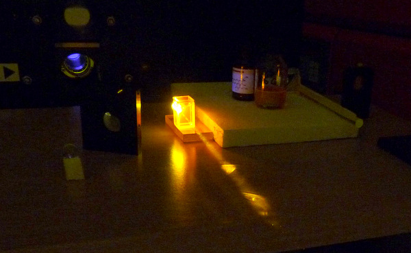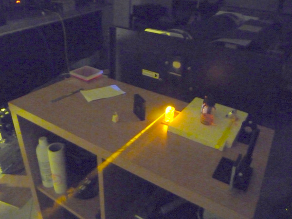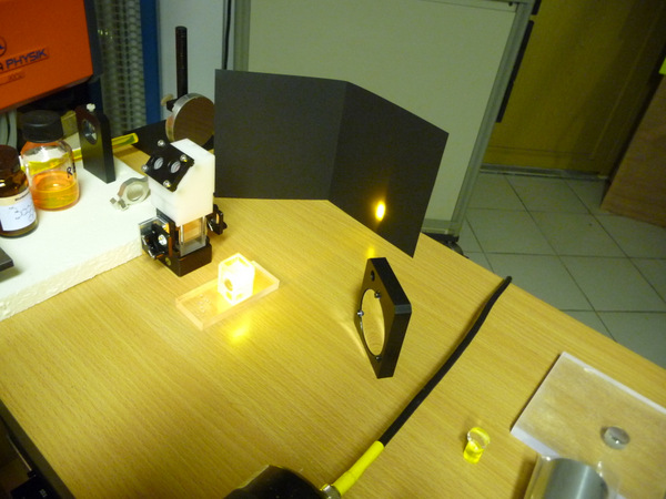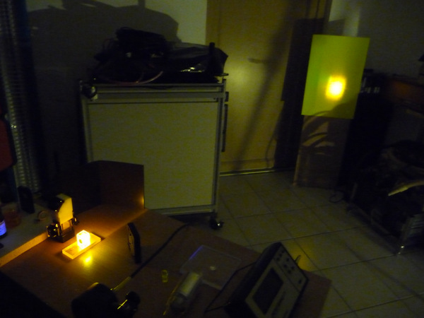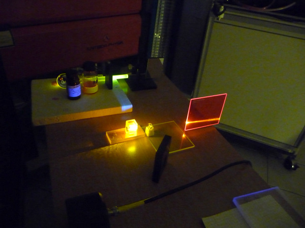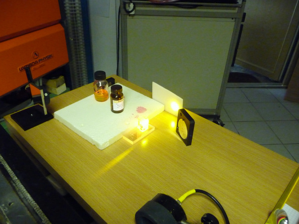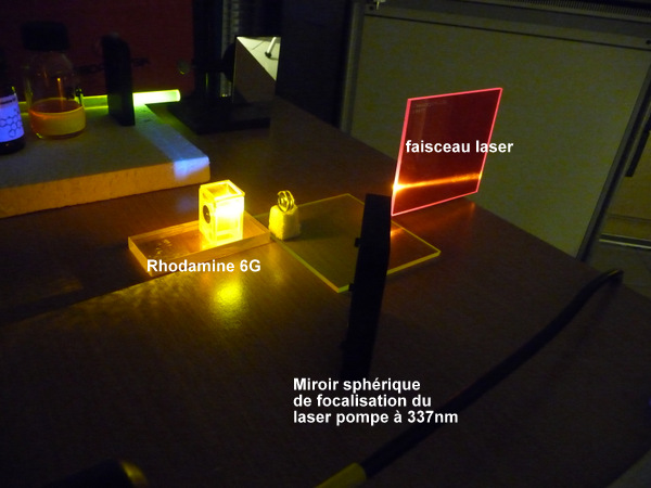 La focalisation est obtenue avec un miroir concave de 200mm de rayon de courbure incliné à 45 degré ce qui produit un faisceau rectangulaire de 15 x 0.5 mm sur la face de la cuvette en quartz de 20X20mm contenant de la Rhodamine 6G à 2.10-3 molaire. L'énergie de sortie du laser à colorant est de 5mJ soit une puissance instantanée de 1.25 MW ! (très dangereux pour les yeux et la caméra )