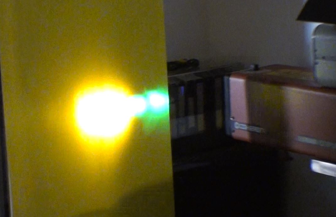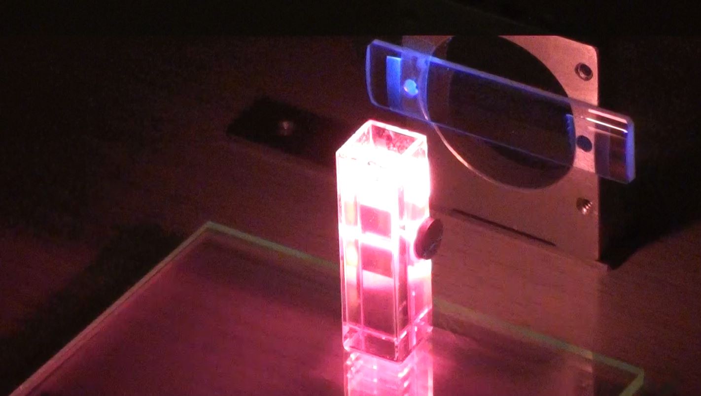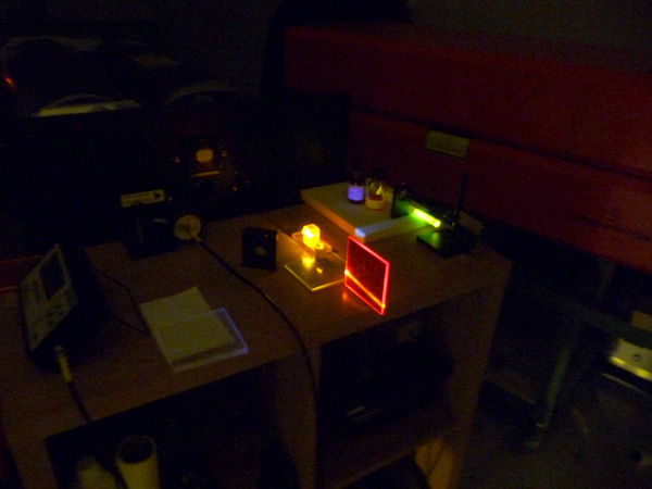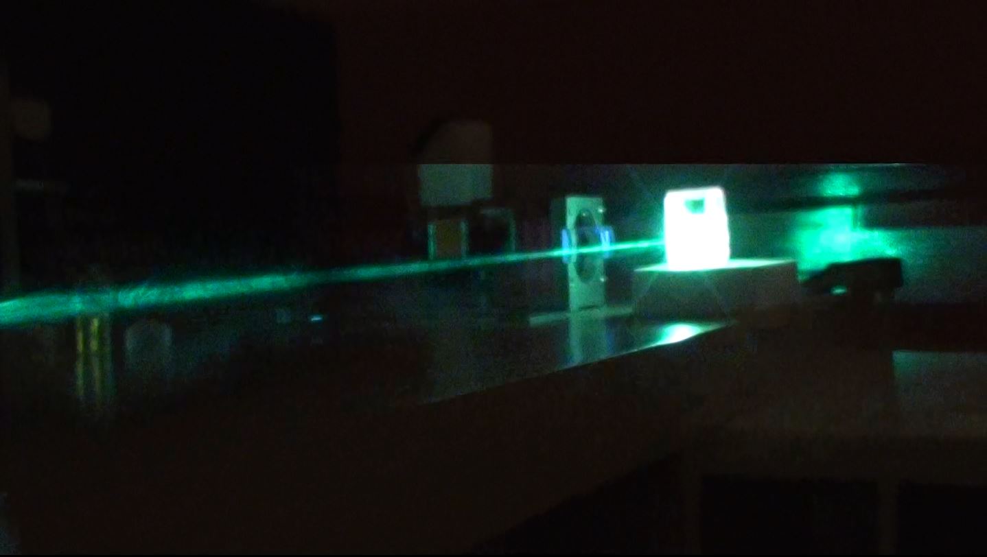 La focalisation est obtenue avec un miroir concave de 200mm de rayon de courbure incliné à 45 degré ce qui produit un faisceau rectangulaire de 15 x 0.5 mm sur la face de la cuvette en quartz de 20X20mm contenant de la Rhodamine 6G à 2.10-3 molaire. L'énergie de sortie du laser à colorant est de 5mJ soit une puissance instantanée de 1.25 MW ! (très dangereux pour les yeux et la caméra )