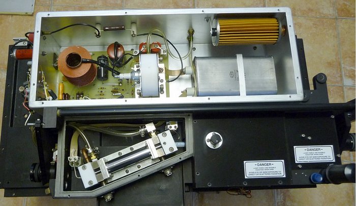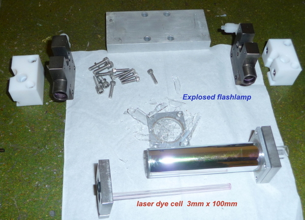circule le colorant. Un condensateur HT de 0.5 uF chargé à 8kV se décharge dans le