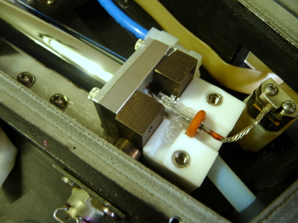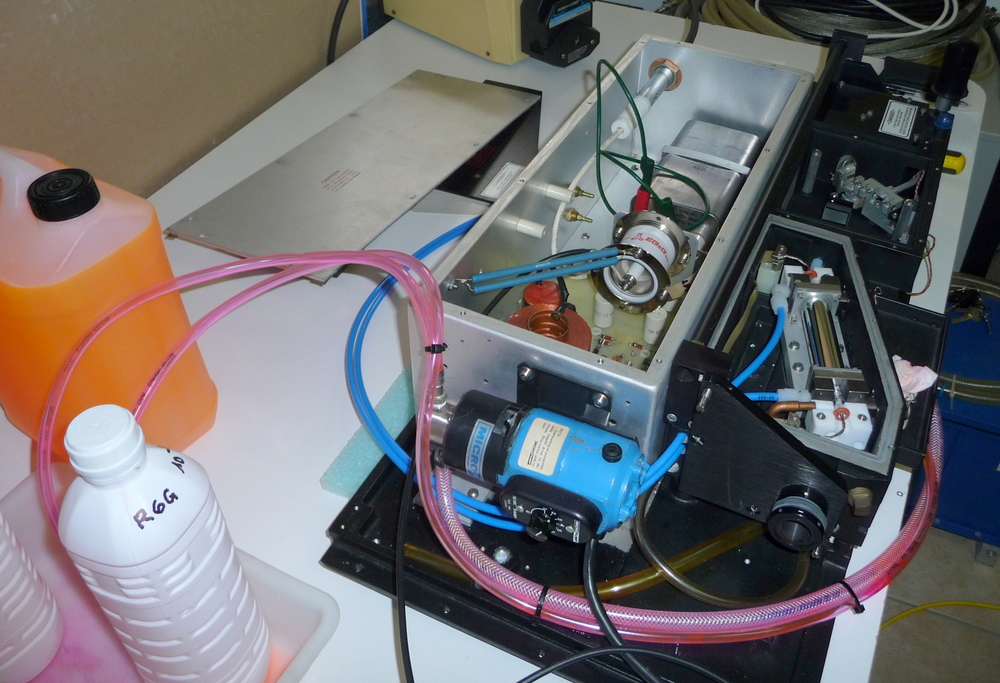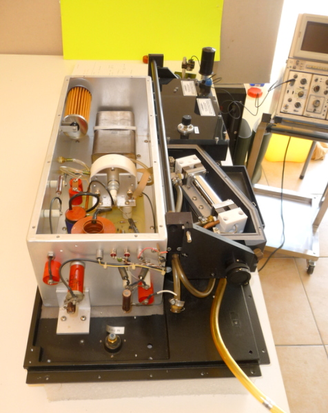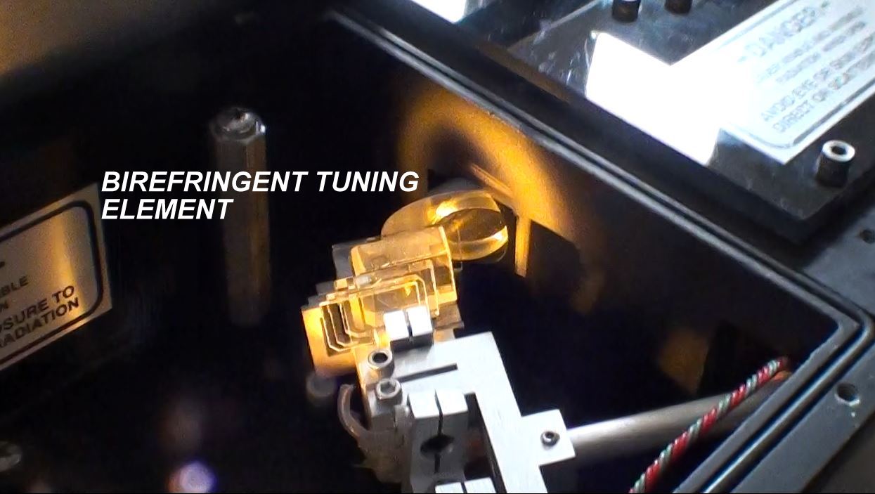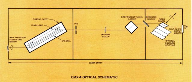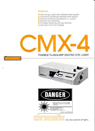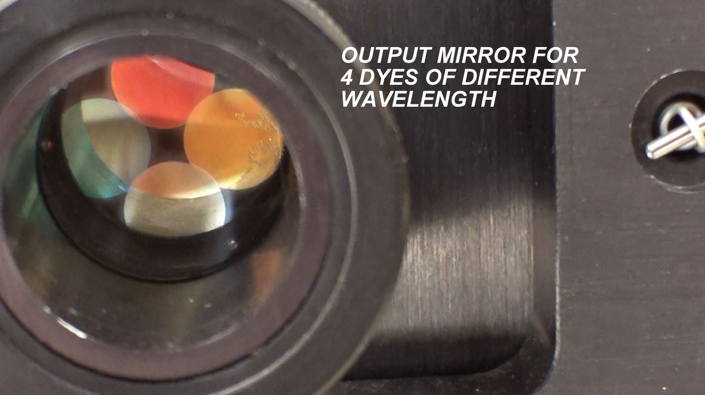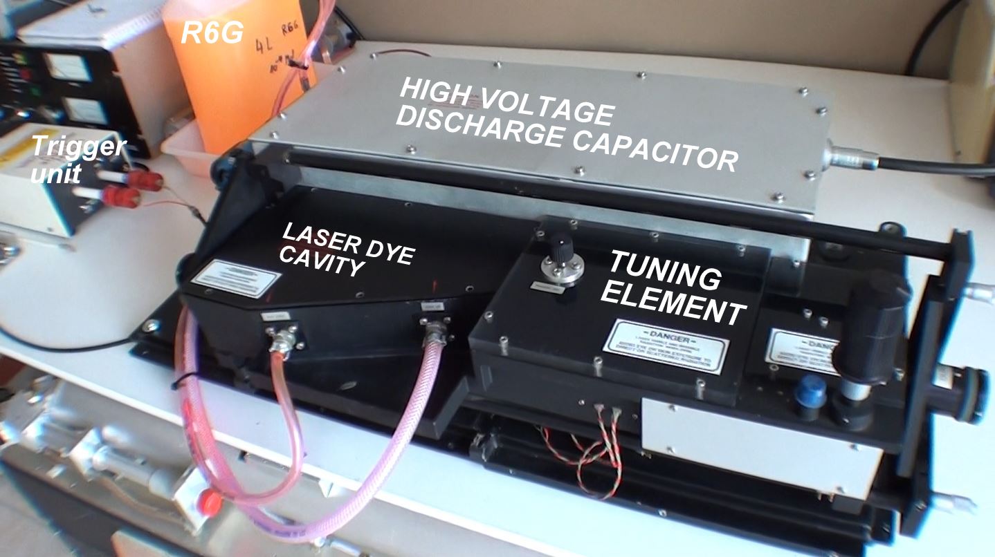 tube flash par un éclateur commandé (trigger). Un système de lames bi-réfreingentes permettent de choisir la longueur d'onde désirée. L'énergie de sortie est de 6mJ par pulse en 1.6 microseconde ce qui donne 10kW pointe. La fréquence de répétition est réglable ente 0.1 et 30 pulses par seconde. Avec 4 colorants on peu couvrir la bande spectral de 435 à 730 nm ! Une largeur de raie de 3cm-1 et avec un étalon de 0.1 cm-1