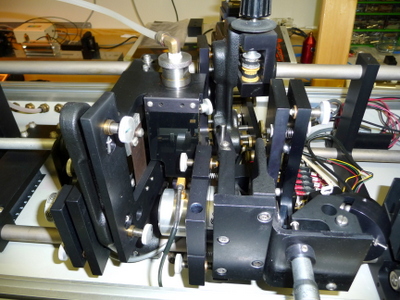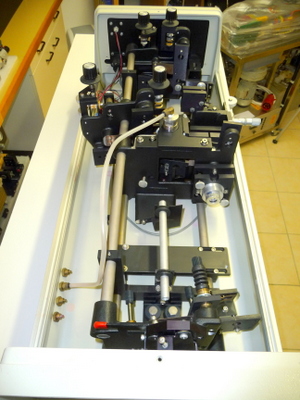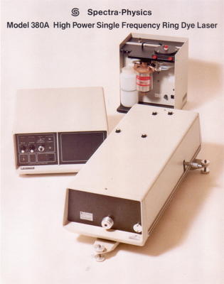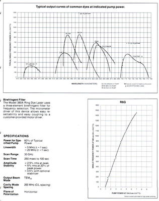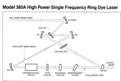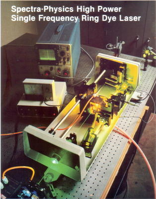 This laser is pumped with an Argon Ion Laser of 8W. Dye Ring laser represents a revolutionary concept in CW dye Lasers. Its stable,single frequency, high power output makes it an ideal tool for applications such as isotope separation, nonlinear mixing, high resolution spectroscopy, optical pumping, CW CARS and other experiments which require intense narrow band width light. 60% output of the pump power, 30 GHz scan rang and 1 MHz Linewidth.