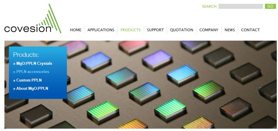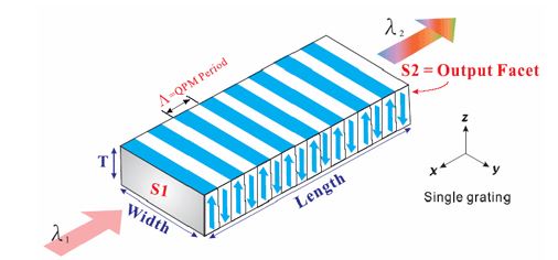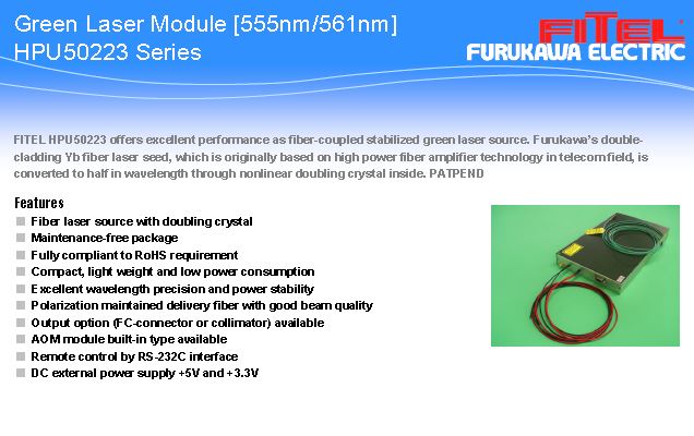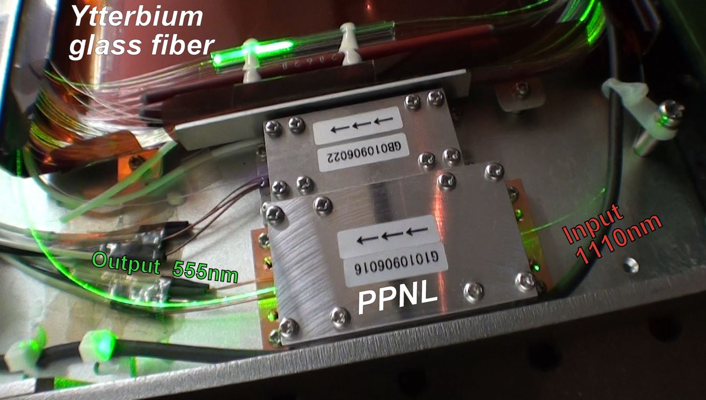 D'un PPLN ( Periodically Poled Lithium Niobate) qui est un cristal à effet non linéaire permettant de convertir une fréquence en une autre. (dans ce cas un doublement) ce qui donne du 555 et du 561nm (vert)
