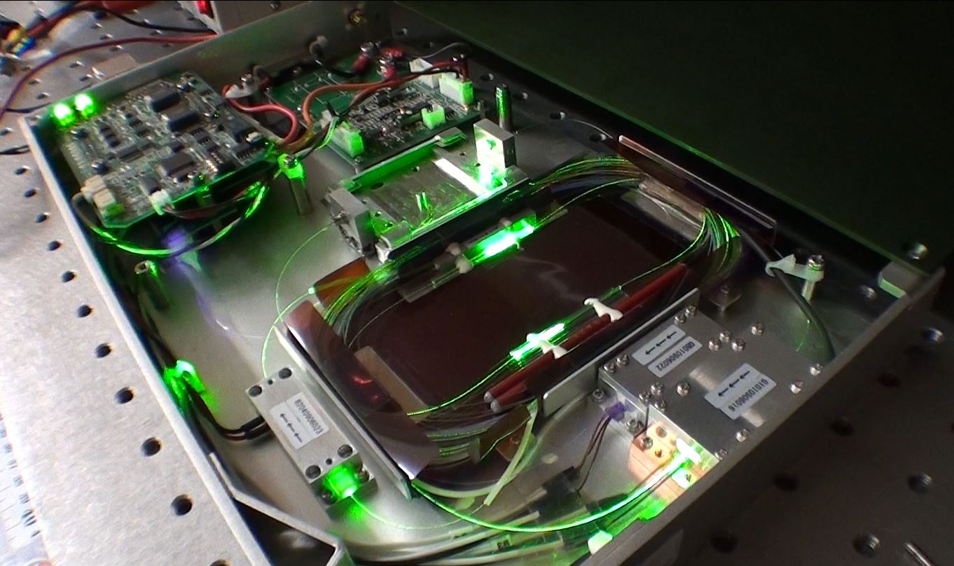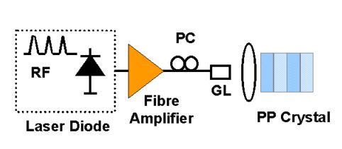 D'une diode laser pompe travaillant à 976 nm qui est centré sur la bande d'absorption de la fibre de silice dopée à l'Ytterbium et émettant à 1100 et 1122nm.