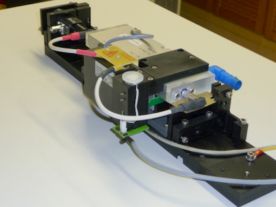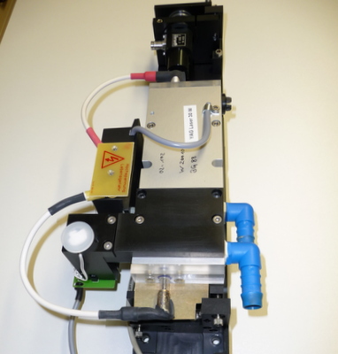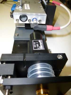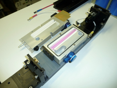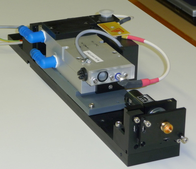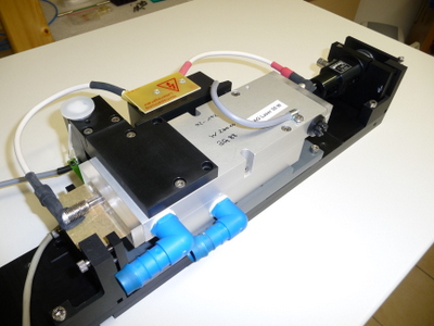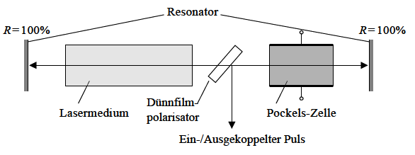 Ce laser à rubis est déclenché par une cellule de Pockel. Le principe de fonctionnement est le suivant:le résonateur est formé de 1 miroirs HR@694nm et un miroir HC de 60% de réflectivité, entre ces 2 miroirs se trouve le barreau de rubis, un polariseur et une cellule de Pockel en KDDP. Durant le pompage du rubis par le tube flash on applique une tension V 1/4 sur la cellule de pockel et lorsque l'inversion de population est maximum on coupe la tension et l'impulsion géante est formée.