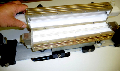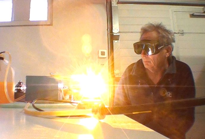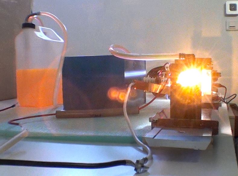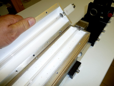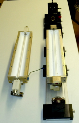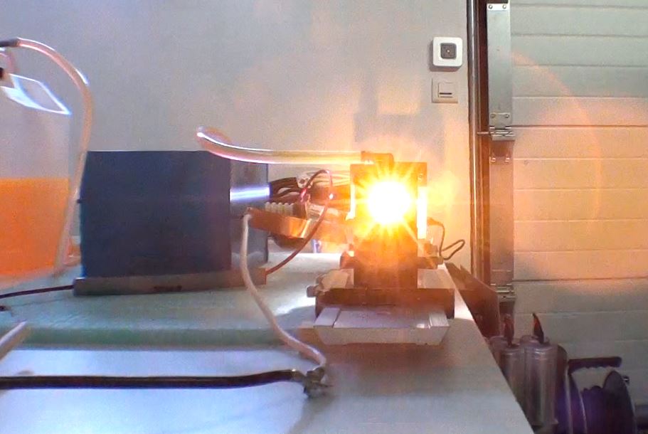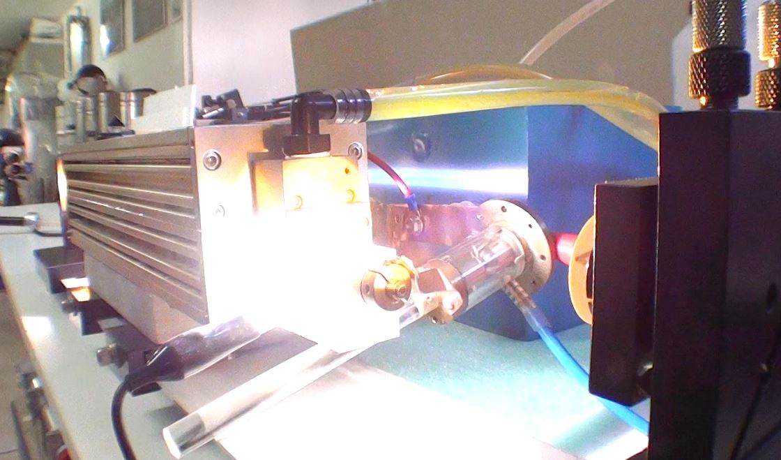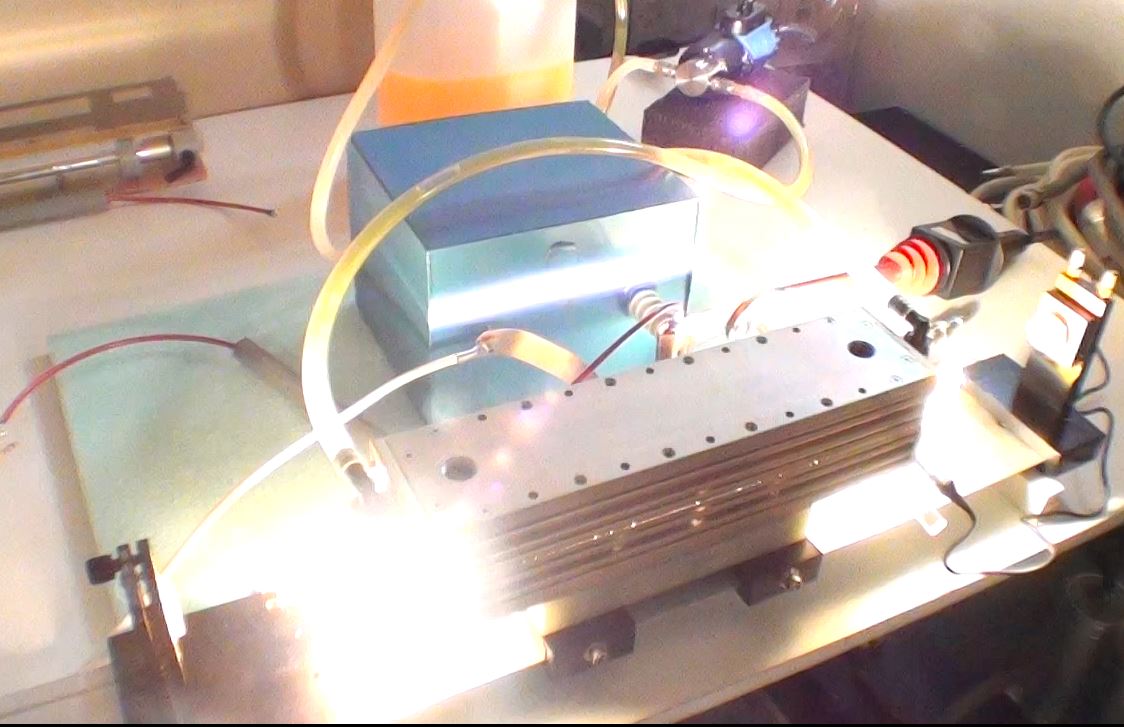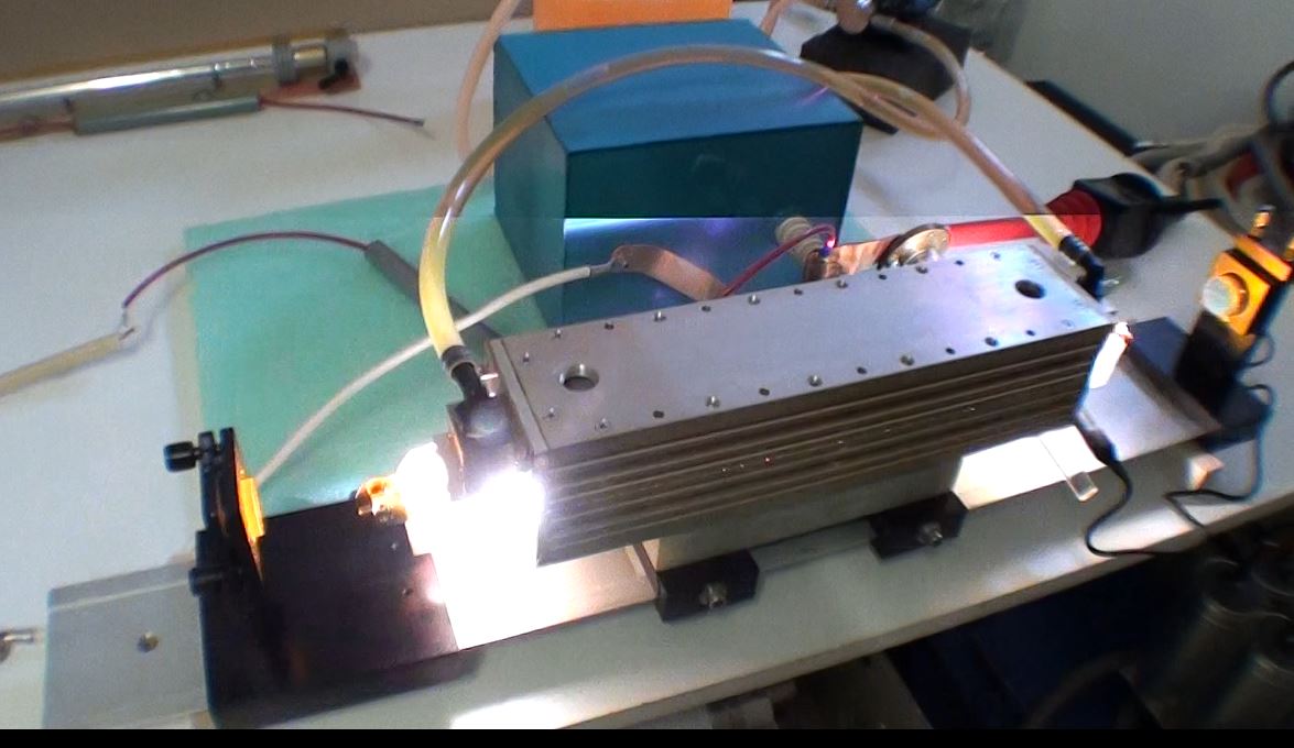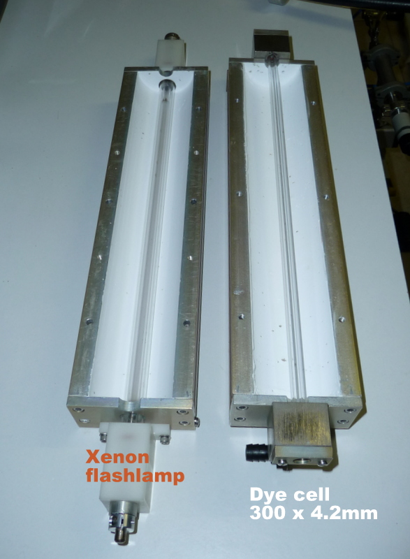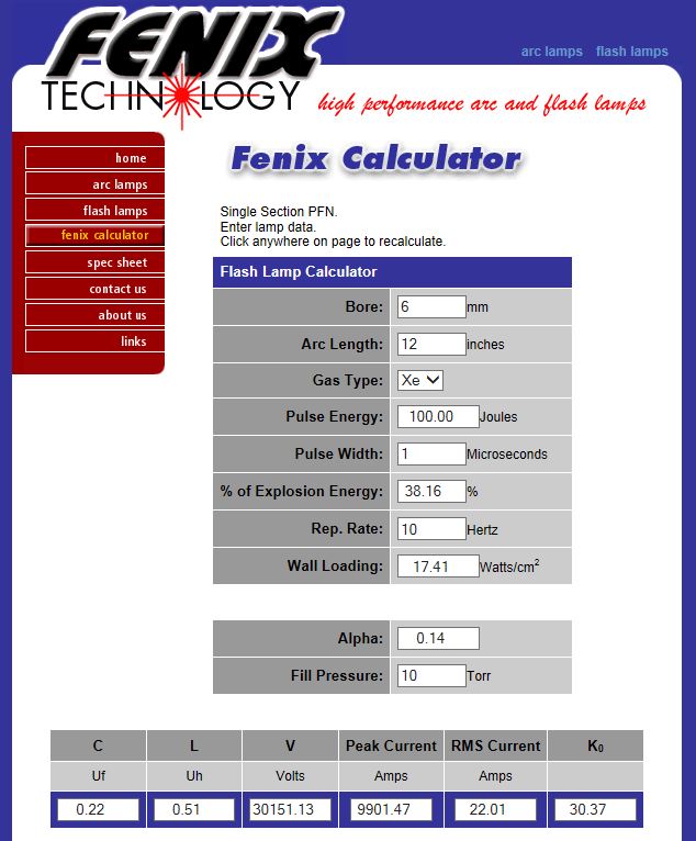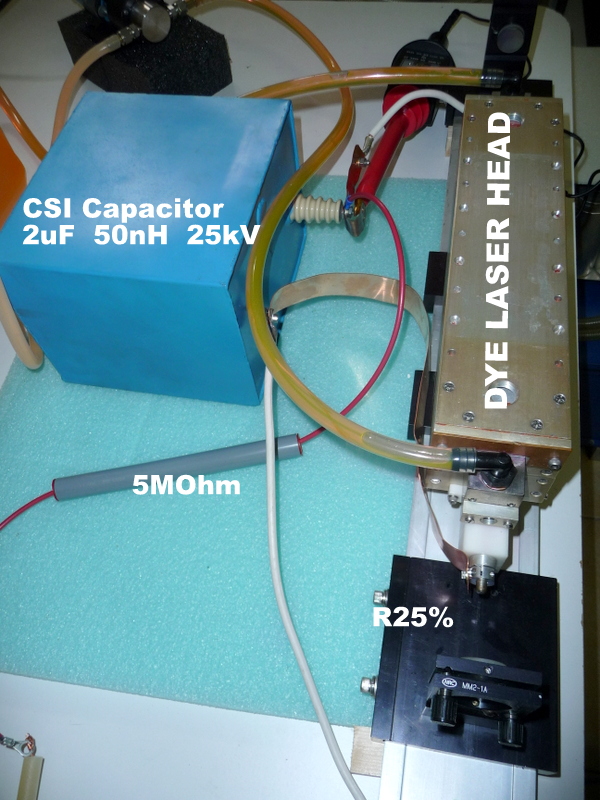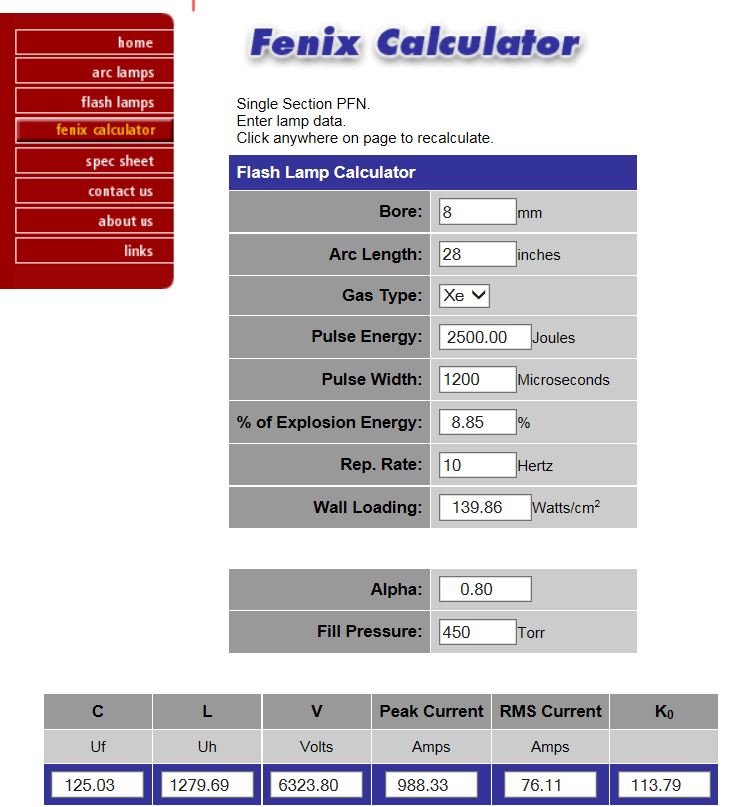 Préparation du laser pour le faire fonctionner : Après une révision complète de la tête laser et modification des entrées du colorant (pour évité que des bulles d'air se forment près des fenêtres de sortie), il s'agit dans un premier temps de connaitre les conditions de fonctionnement du tube flash. Le tube est en quartz diamètre extérieur 7mm et diamètre intérieur 6mm et 300mm de long. Le condensateur de décharge CSI à une capacité de 2 micro Farads et une inductance interne de 50 nano Henry. Avec le calculateur Fenix voici les valeurs pour une capacité de 2uF et 0.22uF
