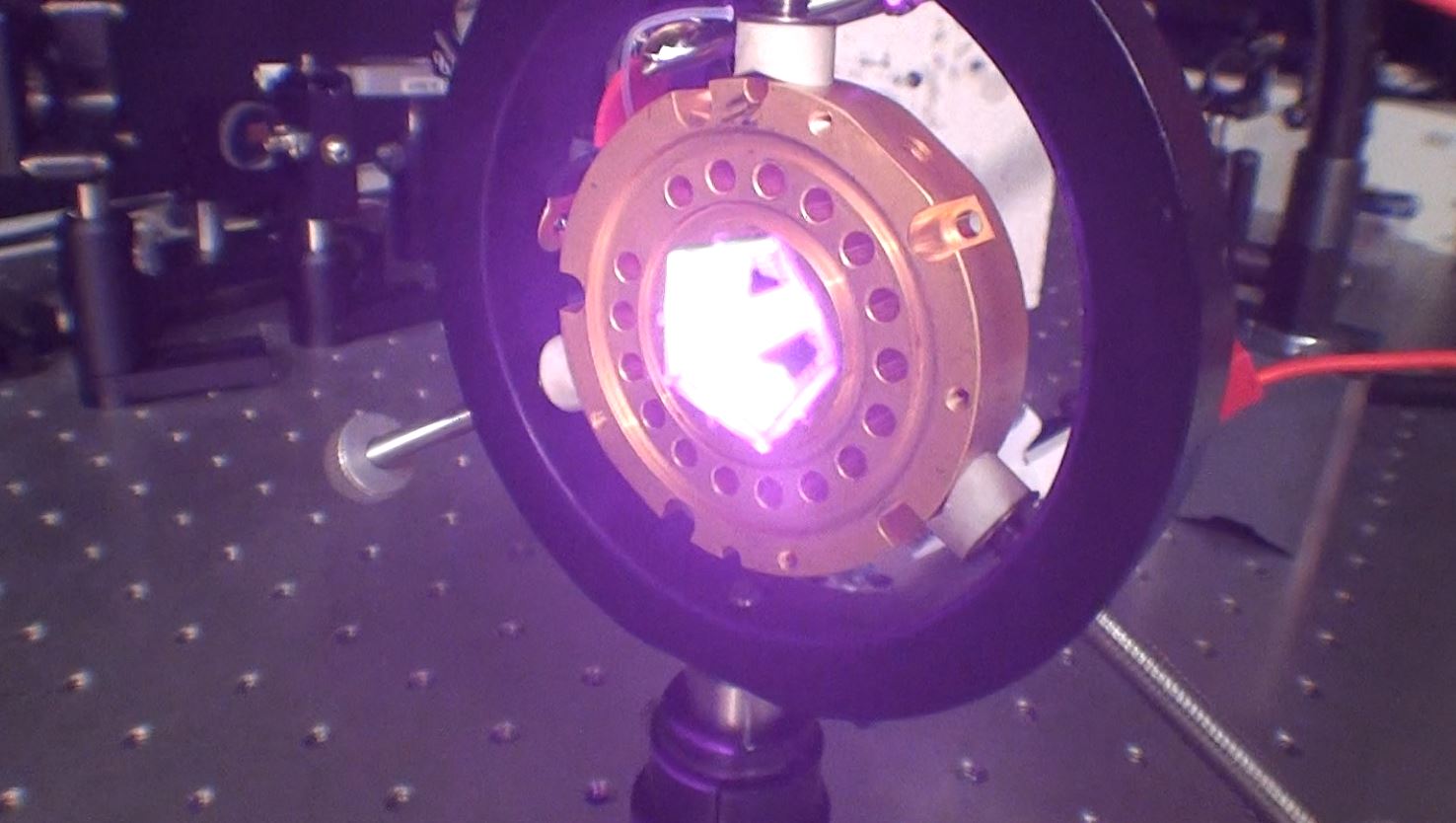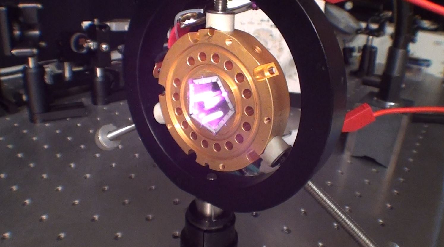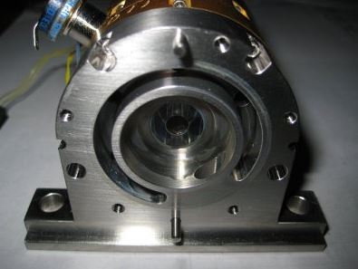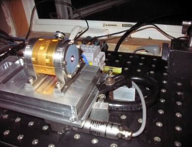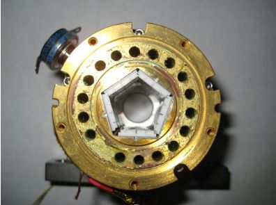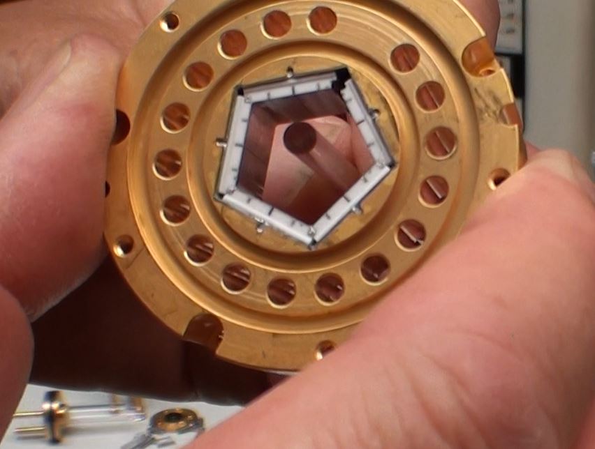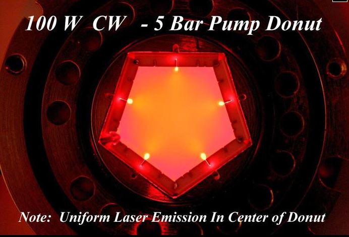 Diode laser COHERENT DONUT 100W Cette diode est une diode spécialement conçue pour le pompage de cristaux YAG. Elle se compose d'un corps en laiton servant de support pour les 5 diodes de 20W chacune et également de corps de refroidissement par circulation d'eau dans les orifices entourant le corps. Dans la partie centrale se trouve un pentagone dont chaque face est une diode laser permettant d'éclairer le cristal laser. Dans l'image de droite on voie la diode en fonctionnement avec la sortie du rayonnement au centre de chaque face et qui diffuse vers le centre de façon homogène pour pompé le cristal laser. Ces diodes peuvent être empilées de façon suivant la longueur du cristal laser de le pompé sur toute se longueur. Sachant que chaque éléments fait 10mm de longueur.