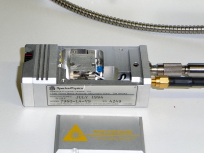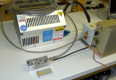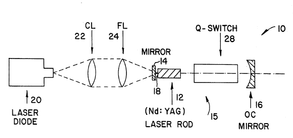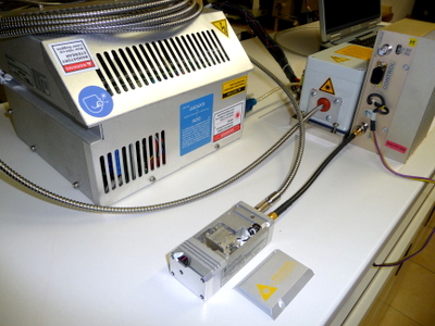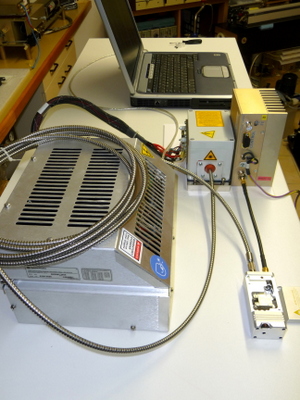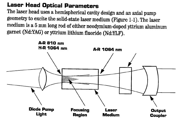 Ce laser DPSS se compose d'une tête laser, d'un générateur HF 27.12MHz pour exciter le modulateur acousto-optique permettant de travailler en mode déclenché, d'une alimentation pour la diode laser et le TEC. La tête laser comprends un cristal Nd:YLF de 5mm de diamètre pompé dans une cavité hemi-sphérique sur une des faces du barreau par une diode laser fibrée à 810nm. Un Q-switch acousto-optique est placé entre le barreau Nd:YLF et le miroir de sortie. La face d'entrée pompe du cristal et le miroir de sortie forme la cavité laser. La lumière pompe est couplée dans le barreau par une lentille qui couple le faisceau pompe avec le volume du mode fondamental TEM00. Le q-switch est l'élément qui présente une perte variable dans la cavité .Un générateur RF permet de contrôler les pulses lasers entre 1Hz et 50kHz.Des pulses uniques peuvent être générés. Le q-switch consiste en un bloc de verre de qualité optique sur lequel sont collés des transducteurs produisant des ondes acoustiques dans le verre. Ces ondes acoustiques produisent des variation d'indice de réfraction qui agissent comme un réseau de diffraction et qui produisent une forte perte dans la cavité . Quand le q-switch est excité il n'y a pas d'effet laser.Quand on coupe l'excitation de la cellule q-switch une oscillation laser prends naissance dans la cavité qui sort sous forme d'une impulsion géante!