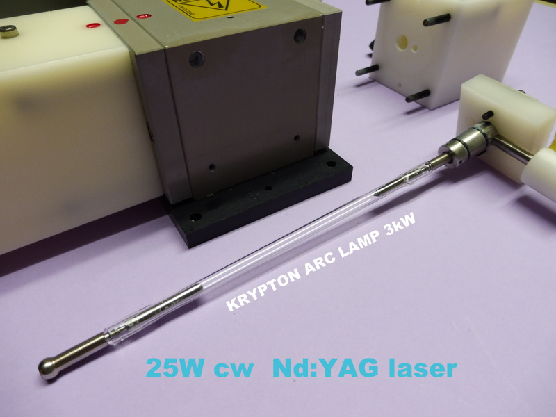 Ce laser Nd:YAG pompé par un tube à gaz de Krypton à une sortie de 25W continu. La lampe à arc au krypton était cassée et je l'ai remplacé par une neuve. Il ne reste plus qu'a faire des tests.