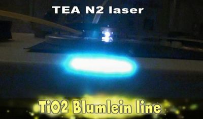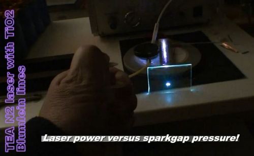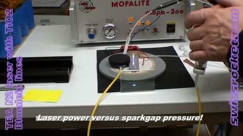 LASER TEA AIR & N2 utilisant une ligne de Blumlein en dioxyde de titane. Ce laser est le premier laser que j'ai construit en 2011 en utilisant un disque de dioxyde de titane (TiO2). Le dioxyde de titane est une céramique ayant un coefficient diélectrique de 70 ! Ce qui permet de réalisé des lasers TEA à AIR et AZOTE de petite dimension. L'éclateur est de type coaxial et le passage de courant traverse le disque de céramique ce qui permet un très faible inductance de celui-ci. La pression de l'air à l'intérieur de l'éclateur détermine la tension de décharge de la ligne de Blumlein. Cette pression je la fais varier avec une seringue contenant de l'air.