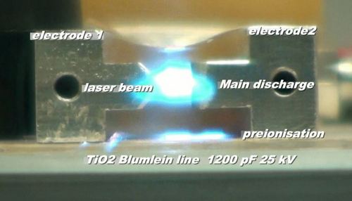 sur cette photo on vois bien la décharge principale avec le rayon laser qui viens frapper une plaque transparente qui fluoresce en bleu. Dessous la décharge principale sur le diélectrique de TiO on vois des arcs plus longs que la décharge principale qui fait office de PREIONISATION !