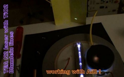Le laser fonctionne avec de l'air deux simple électrodes en laiton nickelées sont posés sur la capacité et l'on vois l'effet laser sur la petite carte. L'énergie du laser fonctionnant à l'air est d'environ 10% par rapport à l'azote à pression atmosphérique. Pour obtenir un fonctionnement à l'air et à pression atmosphérique il faut une ligne de Blumlein avec une impédance caractéristique inférieur à un ohm !