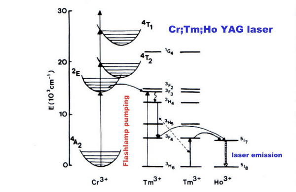 The Cr ion acts as a broad band absorber of the flashlamp continuum radiation and effectively transfers the energy to the Tm ions. A cross-relaxation process results in two Tm ions excited into the upper laser level 3H for every absorbed pump photon. The Ho ion is directly excited into the upper laser level, by non-radiative transfer from the 3H,Tm level. The laser transitionsfor Tm and Ho terminate in the highest levels of the ground state multipleit, thus both are "quasi-3-level" lasers.