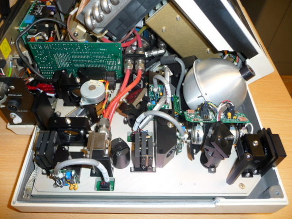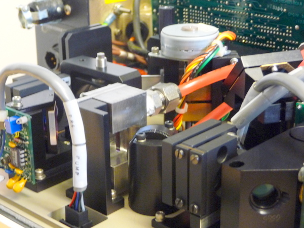 La cellule contenant le colorant se compose d'un bloc en acier inoxydable muni de 2 fenêtres formant une cavité de 0.5mm d'épaisseur sur 10mm de largeur ou circule le colorant à une vitesse de 10m par seconde puis le colorant passe à travers un échangeur de chaleur puis à travers un filtre de 0.2 micron.