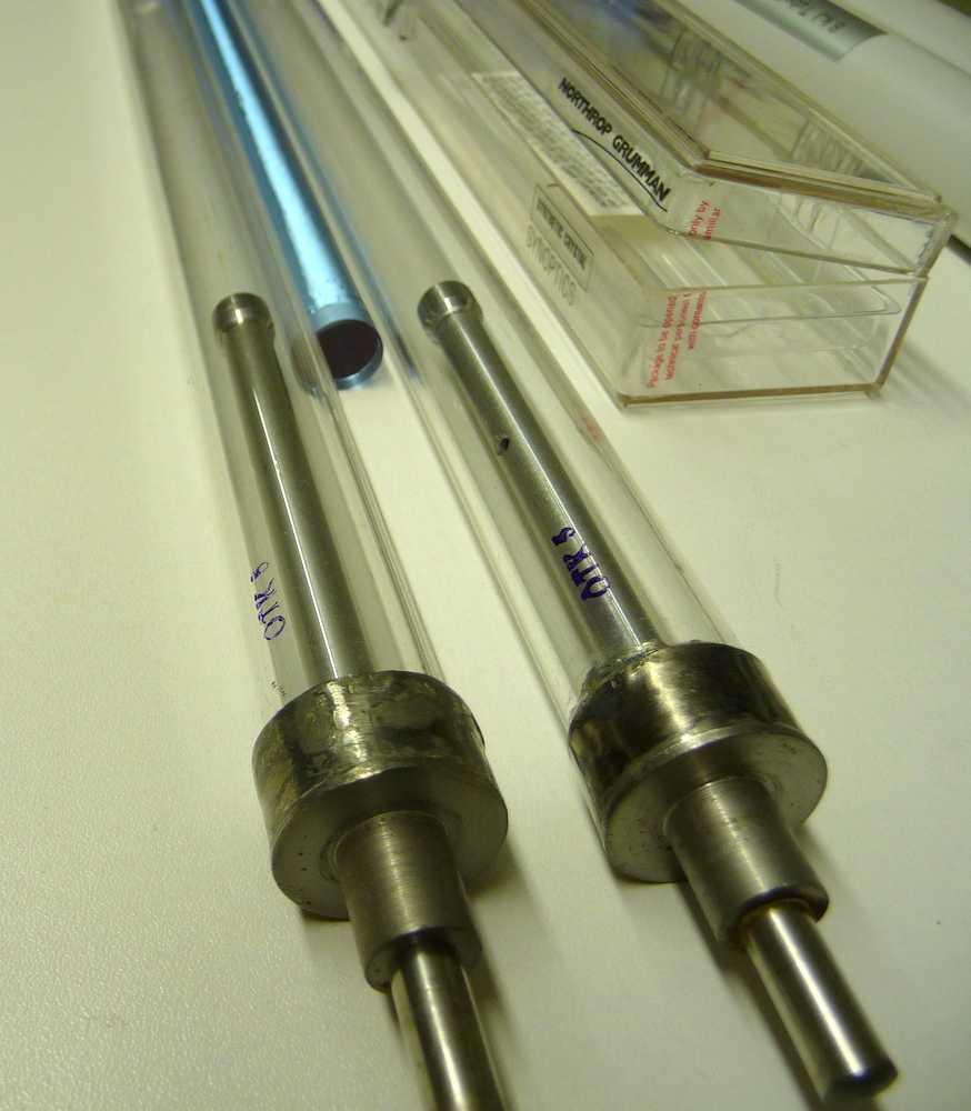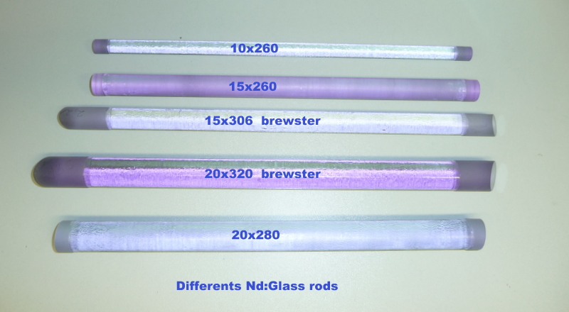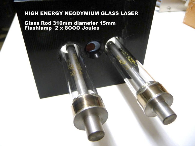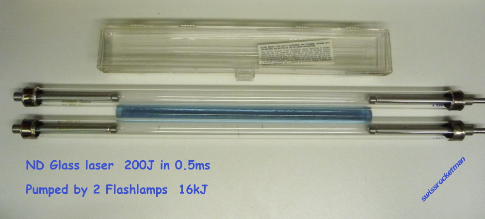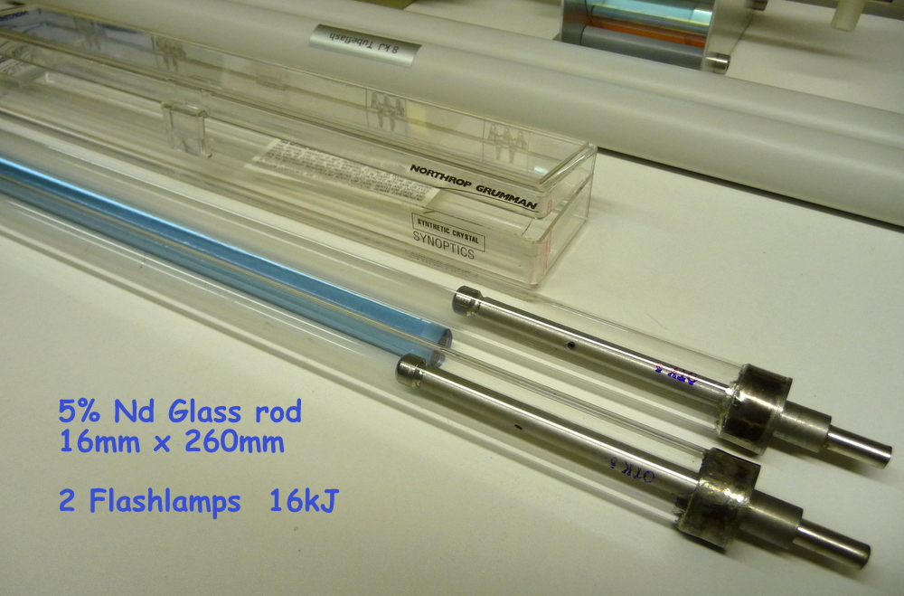 Le verre au néodyme de fabrication Russe contient 5% d'oxyde de néodyme Nd2O3. Les 2 tubes flash également de fabrication Russe délivre chacun des flashs de 8000 Joules soit 16kJ en 800 microsecondes.