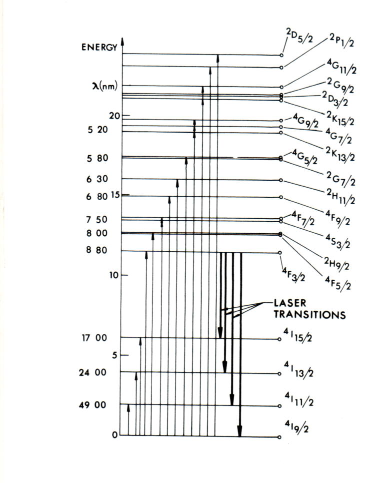 Lors de la décharge dans le tube xénon,l'ion néodyme trivalent absorbe l'énergie lumineuse émise par le flash sur environ 17 lignes discretes entre 350 et 900nm. L'atome excité relaxe par une transition radiative ou multi phonon sur la transition 4F3/2 en 4I15/2 à 1.8 micron, ou sur 4I13/2 à 1,35 micron ou sur 4I11/2 à 1,06 micron ou encore sur 4I9/2 à 0.88um cette dernière raie est résonnante, c'est à dire elle émet et absorbe en même temps! La raie 1.8um et 1.35um n'est pas détectée ceci due à l'absorption de la matrice de verre. La durée de vie radiative de l'état 4I11/2 est de 1.25ns !
