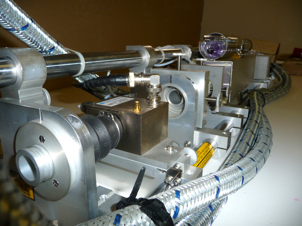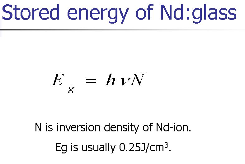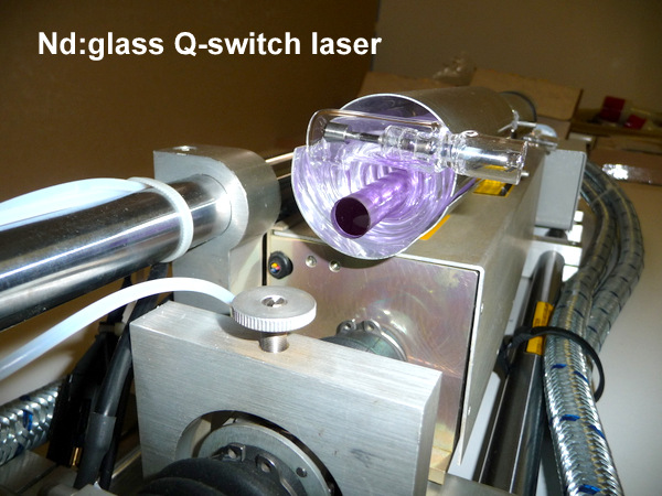Montage d'un laser déclenché équipé d'un verre au néodyme dopé à 3.05.1020ions/cm3 . Ce type de laser présente la particularité d'extraire une grande énergie avec des pulses dans le domaine des 10-20 nanosecondes. Le verre dopé au néodyme est un système à quatre niveau comme le YAG:Nd. La grande différence c'est que pour obtenir le seuil laser il faut lui injecter beaucoup plus d'énergie car il présente une largueur spectral d'émission beaucoup plus importante que le YAG:Nd ce qui présente l'avantage d'obtenir des pulses plus courts. Le gain et l'énergie stockée dans le niveau 4F3/2 est proportionnel à l'intensité de pompage. Le gain pour des pulses picoseconde, nanoseconde, microseconde est le même! Par contre l'énergie maximum (J/cm3 ) que l'on peux extraire dépend de la durée du pulse. Durant la phase de pompage seulement queques 4 à 5% des ions Nd3+ se trouve sur le niveau d'énergie 4F3/2. La largueur de la bande d'émission pour les verres silicate est de 35nm, pour le verres aluminate de 43nm et pour les verres phosphates 25nm.