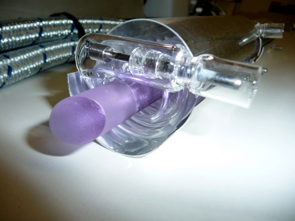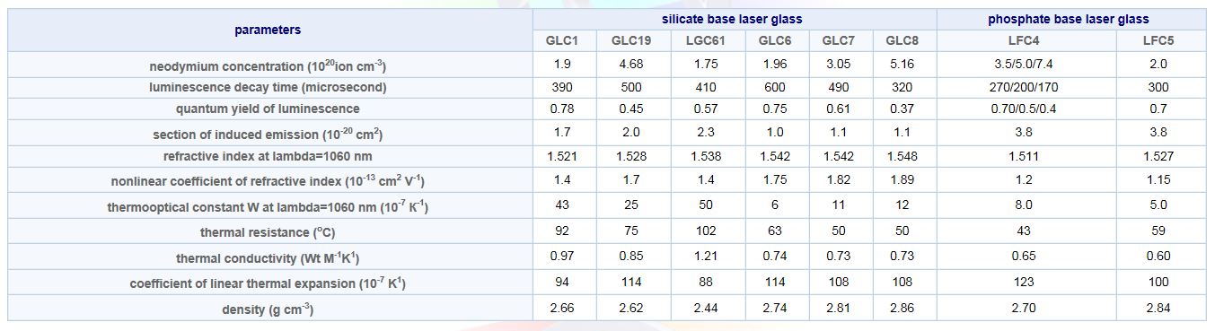 Verre au néodyme type GLC7 dopé à 3.05.1020 ions/cm3. Diamètre du barreau 12mm longueur 260mm V=29.4cm3 Eg=7.35J Tube flash hélicoidal type