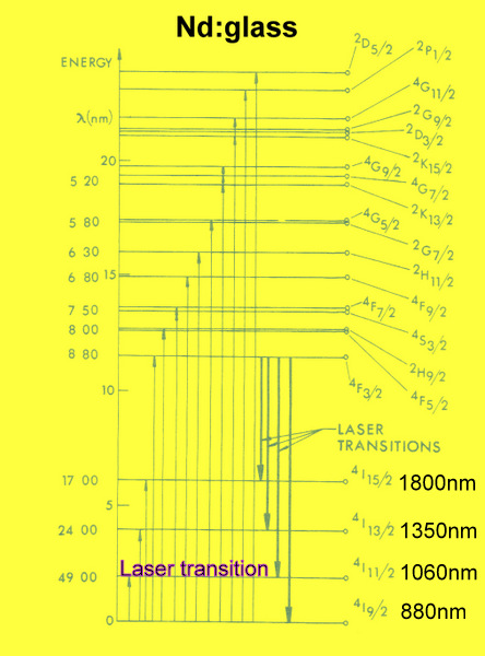 Pour comprendre les niveaux d'énergie dans le ion Nd3+ il est nécessaire d'analyser les différentes transitions. Chose remarquable c'est que le système Nd:glass se comporte à la fois comme un système à 4 niveaux et également comme un 3 niveaux ! Durant le pompage par tube flash, l'absorption se produit entre le niveau fondamental 4I9/2 et les niveaux et vers 15 états d'excitations. Les atomes de ces divers états excités viennent peuplé l'état 4F3/2 d'où partent les diverses transitions lasers. La transition 4F3/2 et 4I9/2 est une transition à 3 niveaux (0.88 um) une ligne résonnante émettant et absorbant en même temps (donc perte d'énergie) La transition 4F3/2 et 4I11/2 est une transition 4 niveaux émettant à 1.06 um produisant le rayonnement laser. La transition 4F3/2 et 4I13/2 est une transition à 1.35 um le verre présente une absorption relativement forte ce qui ne permet pas d'obtenir d'émission laser. La transition 4F3/2 et 4I15/2 est une transition à 1.80 um le verre présente une très forte absorption ce qui ne permet pas d'obtenir d'émission laser. Le temps de fluorescence 4F3/2 est de l'ordre 300 à 600 us. La transition 4I11/2 à l'état fondamental 4I9/2 est de 200ps Les diverses transitions des états excités ( 15 états) dans l'état 4F3/2 se produisent via une transition radiative ou multiphonons très rapidement