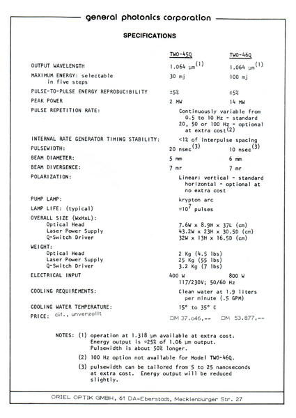 Ce laser de 100 mJ en 10ns se compose d'un cristal YAG:Nd refroidit par eau dé-ionisée ainsi que le tube flash.