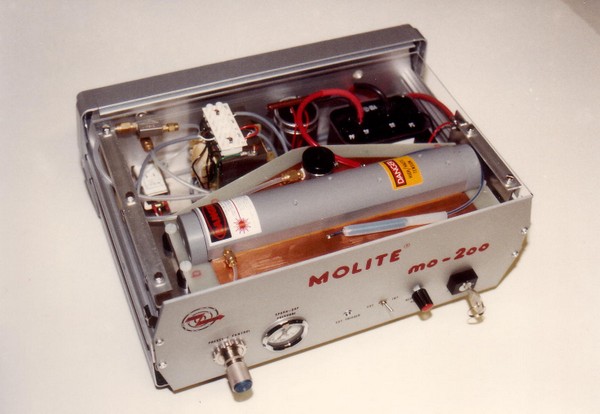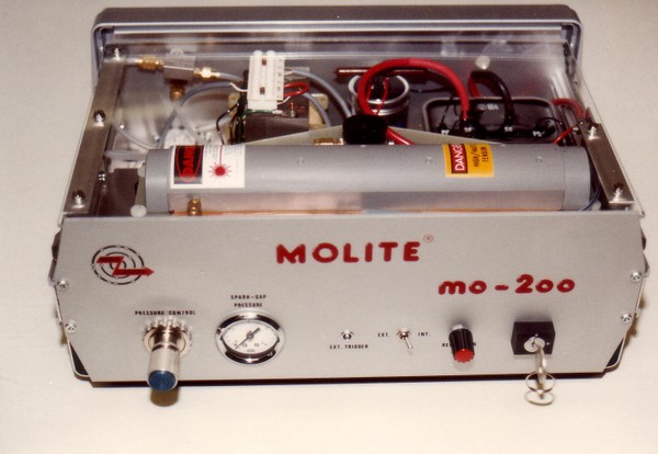 MOLITE 200 Est un laser à azote à décharge transversal et à pression atmosphérique de 200 kW en 1 nanoseconde que j'ai construit pour l'université de Liège en 1977. C'est un laser composé d'une ligne de Blumlein en epoxy board de 0.8 mm d'épaisseur avec des électrodes de décharge en acier inoxydable et un éclateur type coaxial. La cavité de décharge est composée d'un tube de PVC de 10mm d'épaisseur collé sur la plaque Epoxy Board!