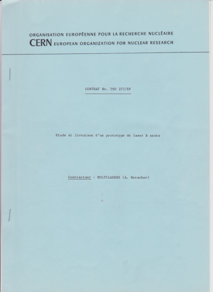 Le 22 avril 1981 j'ai signé avec le CERN un contrat pour l'étude et le développement d'un mini laser à azote Contrat No 590 255/EF. Le but était par la suite que le CERN fabrique 60 lasers pour la calibration du détecteur UA1 du LEP (groupe Carlo Rubia) Le "cahier de charges" stipulait une énergie minimum de 20 microjoules. Or a la livraison ces lasers sortaient 100 microjoules donc le CERN a lancé la fabrication d'une centaines d'unités dont 60 furent installés sur le détecteur UA1.