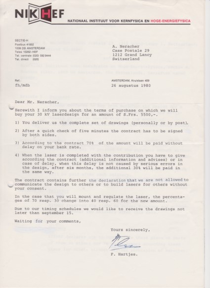 J'ai également retrouvé dans mes papiers une lettre datée du 26 août 1980 que m'adressée Mr. Fred Hartjes pour acheter des plans pour la construction du laser à azote limite de diffraction que j'avais livré au PhD Hans Hilke du CERN.