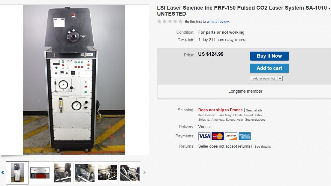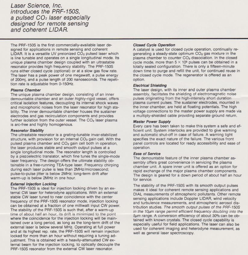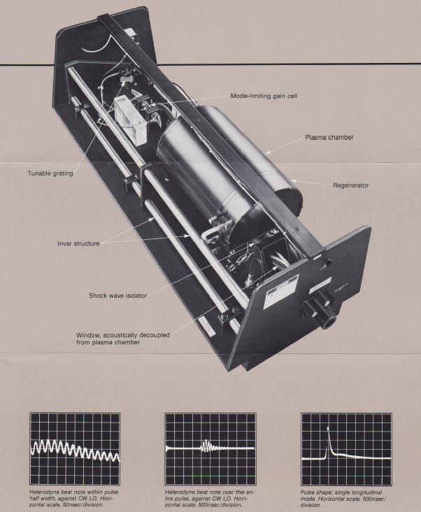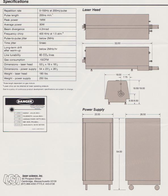 Le laser LSI CO2 150pps permet de généré des pulses entre 9.6 et 10.8 microns de 200mJ en 100ns. Avec le miroir arrière muni d'un réseau de diffraction réglable il permet de sélectionner 60 raies discrètes de fréquence. Il travail sur le mode fondamental TEM00.