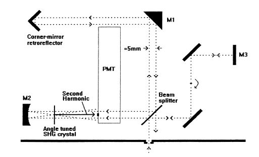 | L'auto-corrélateur se compose d'une lame séparatrice de 1 micron d'épaisseur sur laquelle le faisceau à analyser est divisé en 2 parts. Une part est dirigée dans un bras fixe et l'autre part est dirigée dans un bras muni de 2 miroirs tournant autour d'un axe à 10 tours par seconde et renvoyé par le miroir M3 sur le miroir M2. Ce bras varie de longueur 20 fois par seconde. Le faisceau issue du bras fixe est renvoyé sur le miroir M2. Le miroir M2 concave focalise les 2 faisceaux sur un cristal doubleur de fréquence. Le faisceau doublé en fréquence entre par un orifice de 0.5mm sur un photomultiplicateur. Le gain est réglé par la tension d'alimentation entre 100 volts et 1000 volts. Avec une fréquence de rotation de 10Hz l'affichage sur l'oscilloscope est de 31.9ps/ms Pour un pulse de forme Gaussien le coefficient est de 0.707