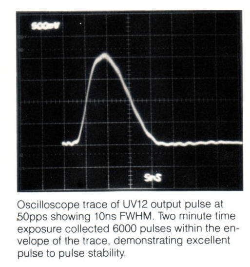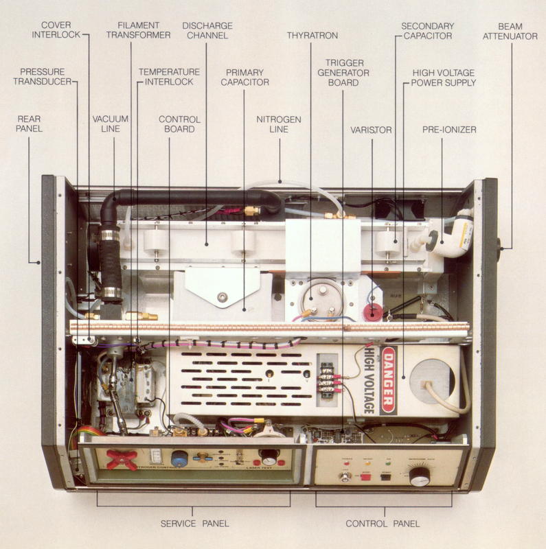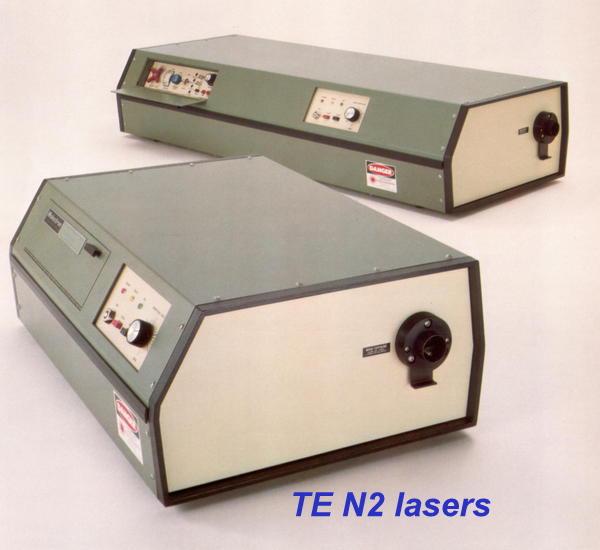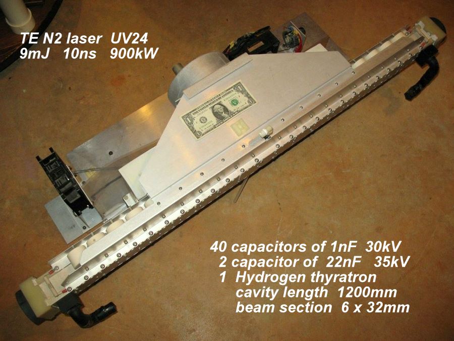 Laser à azote à décharge transversal travaillant à une pression de 20 à 40 Torr. Ce laser de la société MOLECTRON à été conçu spécialement pour le pompage de colorants en produisant des pulses de longue durée(10ns) ce qui permet d'avoir un très bon rendement de l'ordre de 15% !