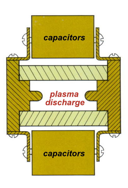 Elle se compose de 2 électrodes de décharge sur lesquelles se trouve fixé 40 condensateurs en titanate de baryum de 1nF 30kV formant la capacité C2.