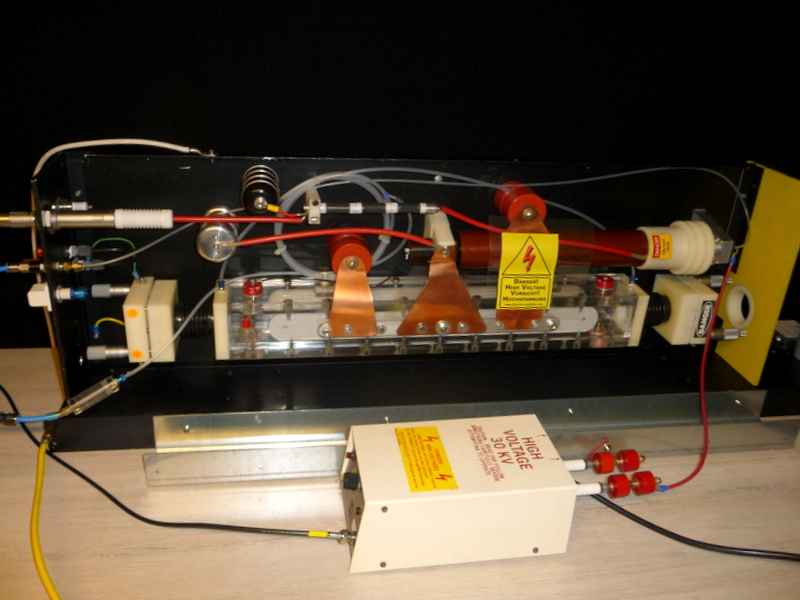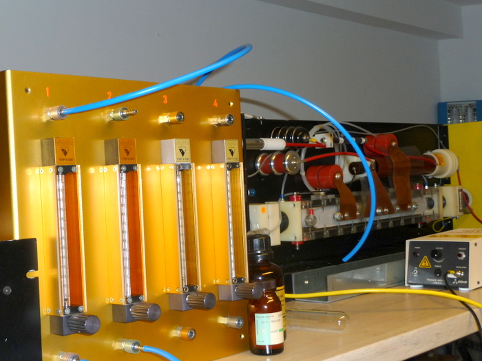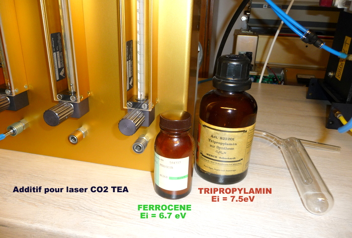 Utilisation de tri-propylamine ayant un potentiel d'ionisation de 7.5 eV permettant d'obtenir une décharge homogène à pression atmosphérique dans un mélange de 50% He , 25% N2 et 25% CO2. La pression de vapeur du tri-propylamine à 25°C est de 3.69 mmHg ce qui nécessite d'avoir 5-6% du débit de gaz contenant le tri-propylamine dans le mélange gazeux He/N2/CO2 réglé au moyen de 2 débimètres à bille. On peut également utilisé du Ferrocène qui est une poudre brunâtre presentant un pression de vapeur à 40°C de 0.03 mmHg soit 100 fois moindre alors il faut chauffé celle-ci à 80°C et faire circuler tout le mélange de gaz à travers. Le potentiel de ionisation est de 6.2 eV (ethyl ferrocène)