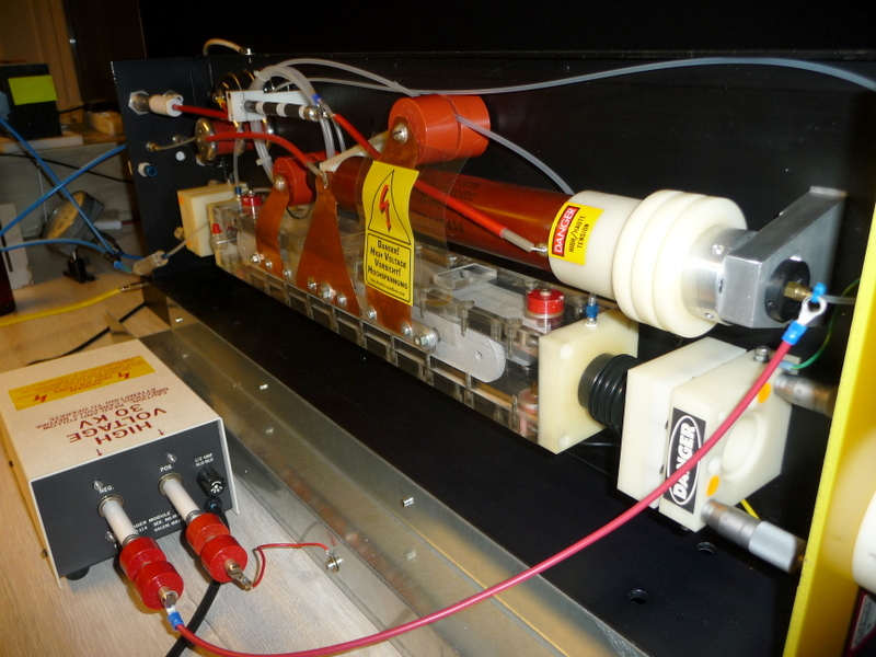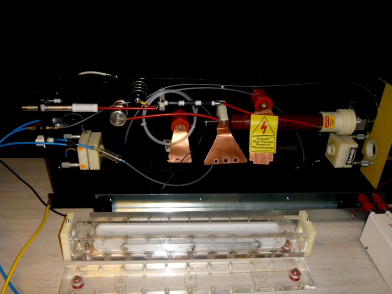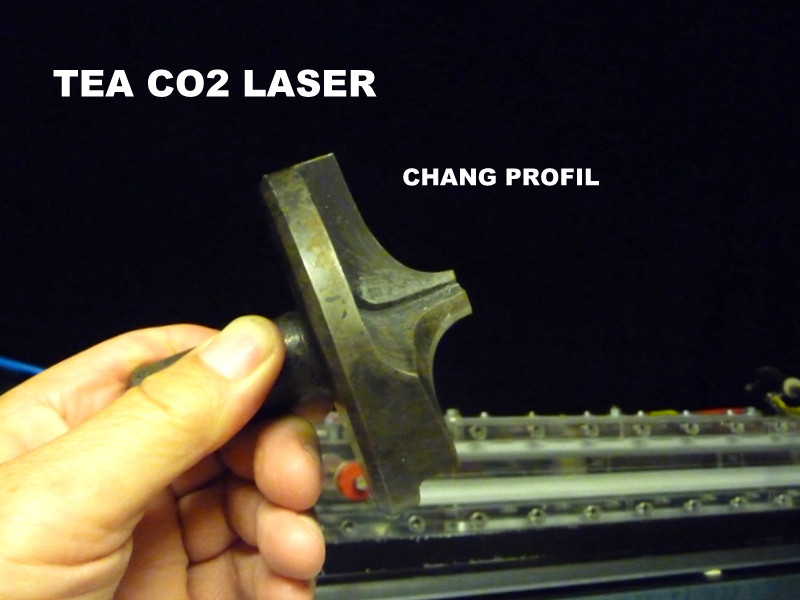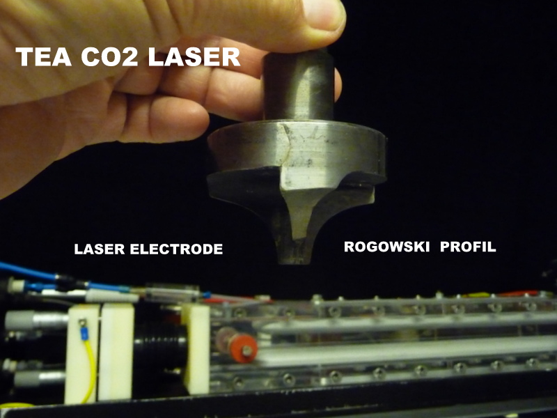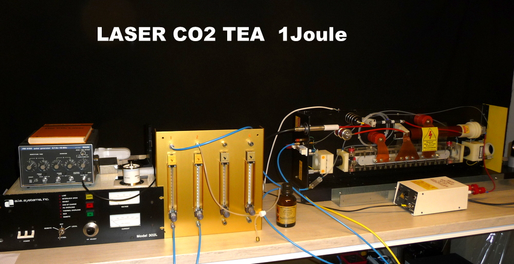 Ce laser se compose d'une enceinte en plexiglass muni de 2 électrodes de Rogowski distante de 12 mm et de 30mm de large. Il est muni d'un système de préionisation du type Pearson et Lamberton composé de 2 fils en acier inoxydable de 0.2 mm de diamètre couplé sur 4 condensateurs de 500 pF /30 kV.