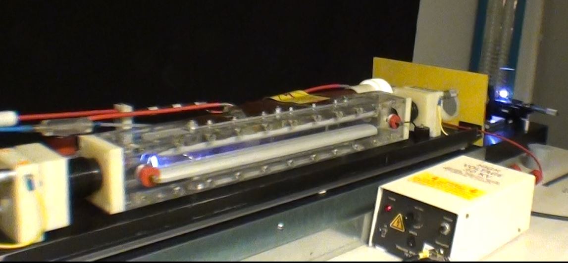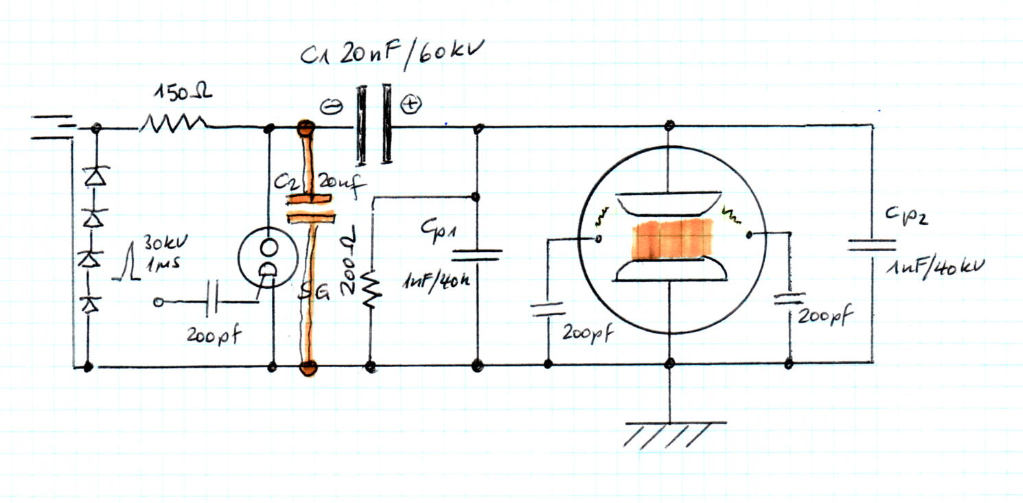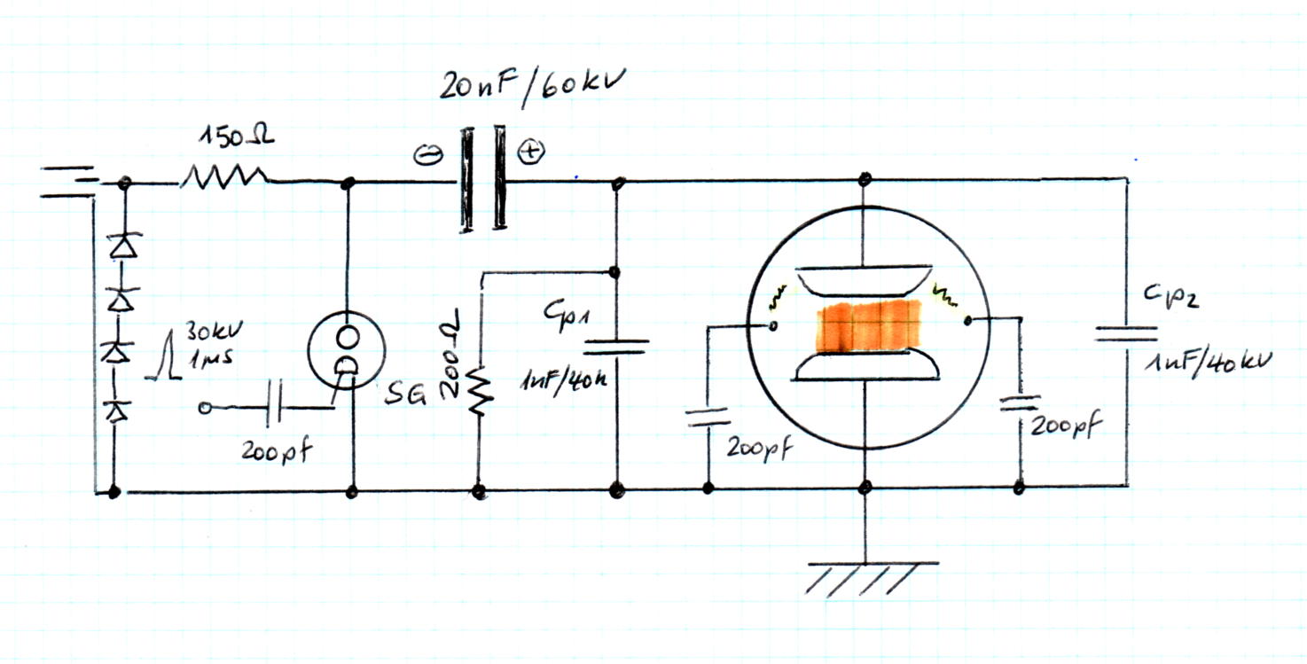 Essai pour obtenir une décharge plus homogène et éviter les arcs entre les 2 électrodes de décharge. J'ai monté un condensateur de 20nF/50kV aux bornes de l'éclateur de manière à avoir une montée en courant plus importante et une tension également plus grande.