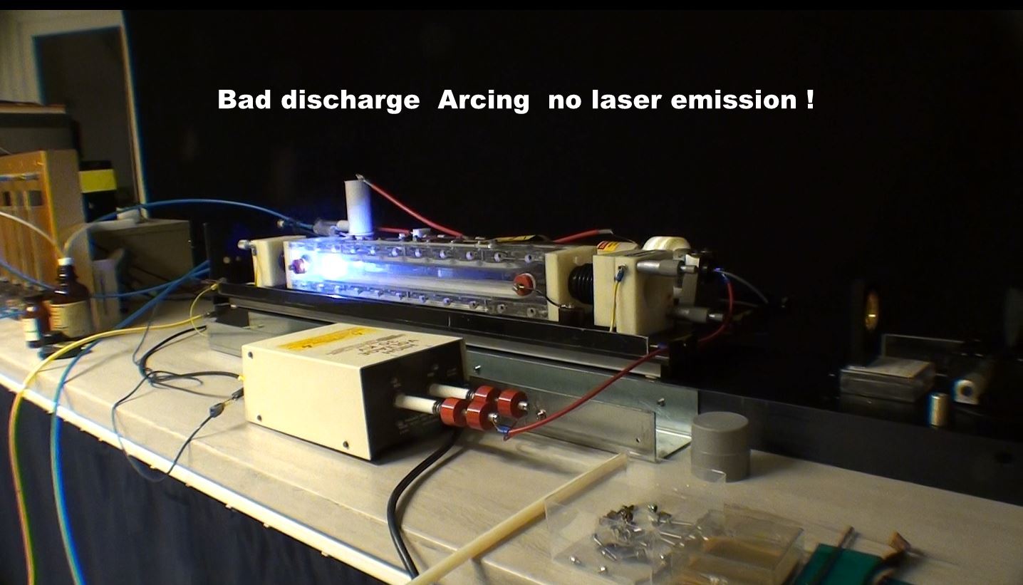 Pas d'effet laser car la décharge entre les électrodes passe en régime d'arcs et pas de décharge homogène (glow)