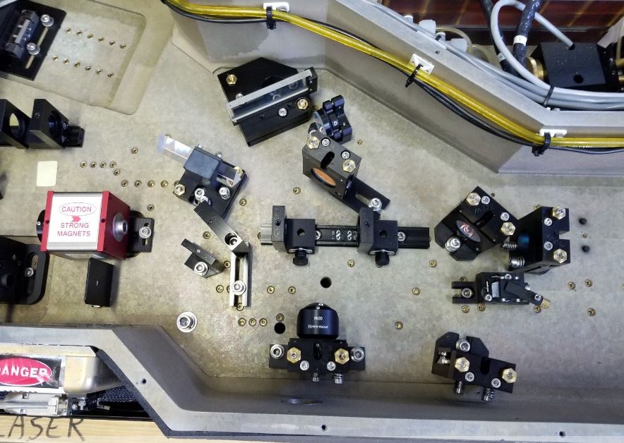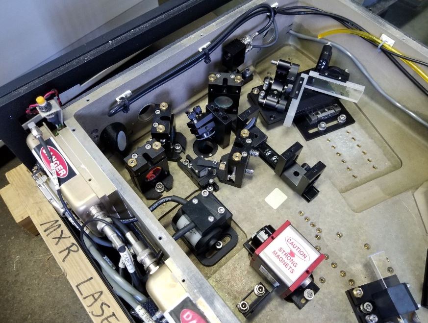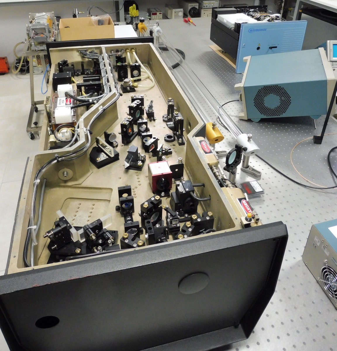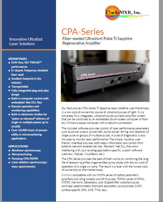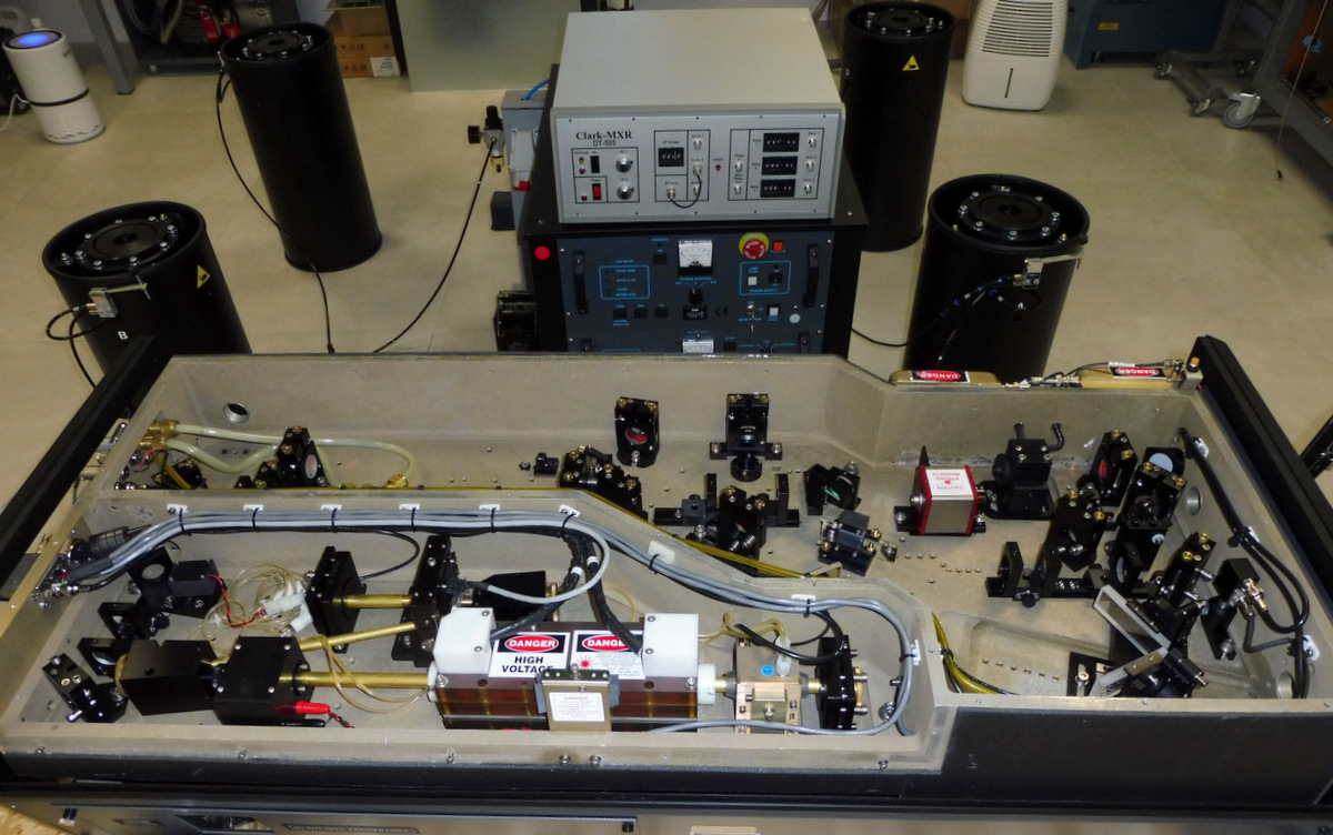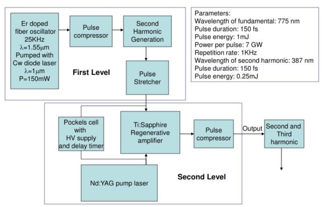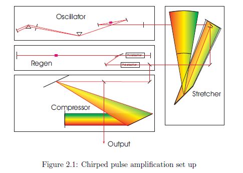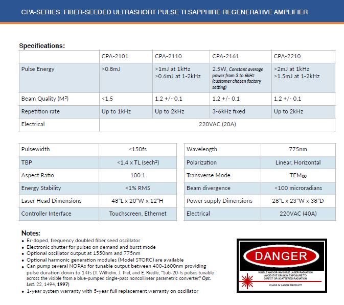 Le laser CPA-2010 se compose d'un oscillateur femtoseconde à fibre émettant des pulses de 43pJ durant 100fs à 1550nm. Un doubleur de fréquence permet d'obtenir des pulses à 775nm avec un fréquence de répétition de 35MHz. Au moyen d'une cellule de Pockel on isole 1 pulse que l'on va amplifier. Puis le faisceau entre dans un étireur/isolateur model PS-1000 qui allonge le pulse d'un facteur de 2000 ce qui évite lors de l'amplification de détruire l'optique par l'énorme intensité lumineuse. Maintenant la durée du pulse est de 200ps et elle est dirigée au moyen d'une cellule de Pockel dans une unité TRA-1000 appelée amplificateur régénératif ou il va traversé un cristal titane:sapphire une quinzaine de fois pour obtenir un signal amplifié de 5.107 Le cristal titane:sapphire est pompé par un laser Nd:YAG doublé en fréquence émettant des flash de lumière vert de 170ns et de 20mJ à 1KHz. Le pompage du Nd:YAG est fait par une lampe à arc au Krypton de 2kW. Puison recompresse le pulse au moyen d'un compresseur PL-1000 pour a nouveau obtenir un pulse de 100fs avec un énergie de 1mJ soit une puissance instantanée de 10GW ! à une fréquence de 1kHz !