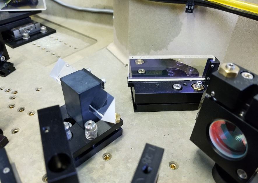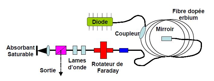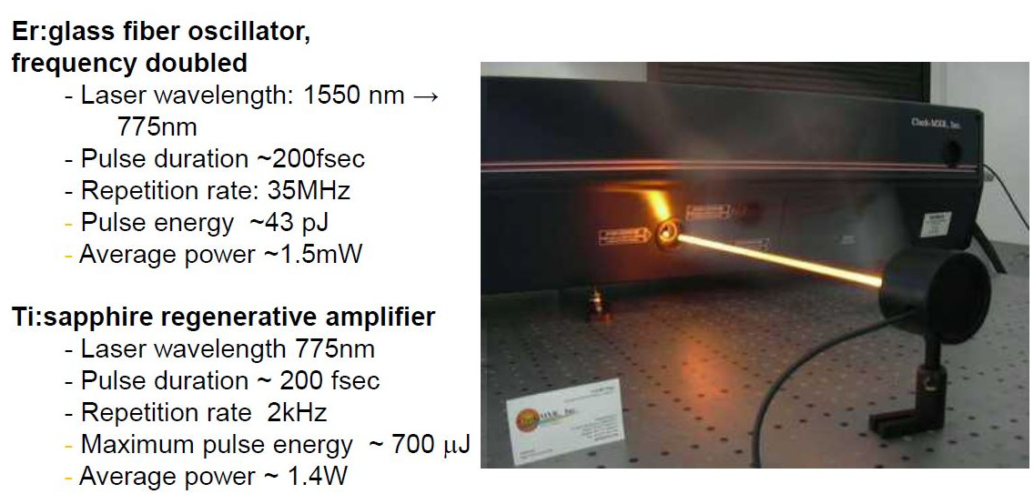 Ce laser est muni d'un oscillateur femtoseconde fibré. Il se trouve sous la table d'optique. L'avantage de ce type d'oscillateur fibré est qu'il est très compact et sans réglages ni entretien. Une diode laser pompe une fibre de verre dopée à l'erbium émettant à 1550nm et le blocage des modes est obtenu au moyen d'un miroir SESAM. A la sortie de l'oscillateur l'énergie est de 43pJ avec une fréquence de 35MHz. On traverse un doubleur de fréquence pour obtenir des pulses à 775nm qui sont envoyer dans l'amplificateur régénératif.