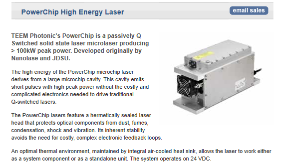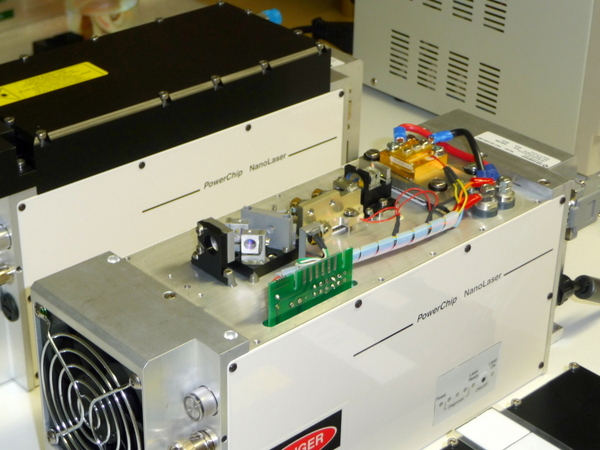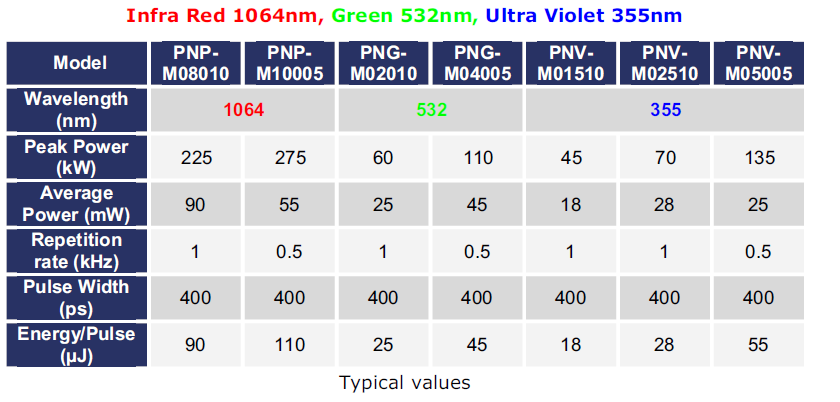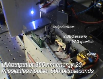 JDSU Nanolaser is composed of a microchip cavity consisting of a layer of Cr+4 YAG saturable absorber embededmonolithically in a YAG:Nd+3 laser crystal pumped with a pulsed laser diode at 808 nm. The output IR pulse at 1062 nm is triplet in 2 BBO non linear crystal to obtain UV pulse at 355 nm. With 500 picosecond and 20 kW peak power at 1000 pps repetition rate. Application : LIDAR,LIBS,Fluorescence, material processing, micro marking MALDI-TOF for Genomics